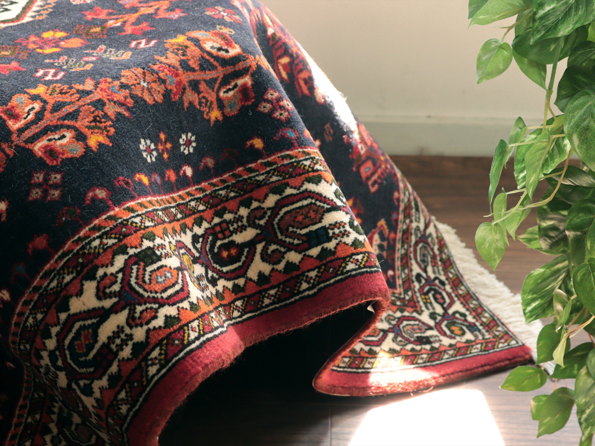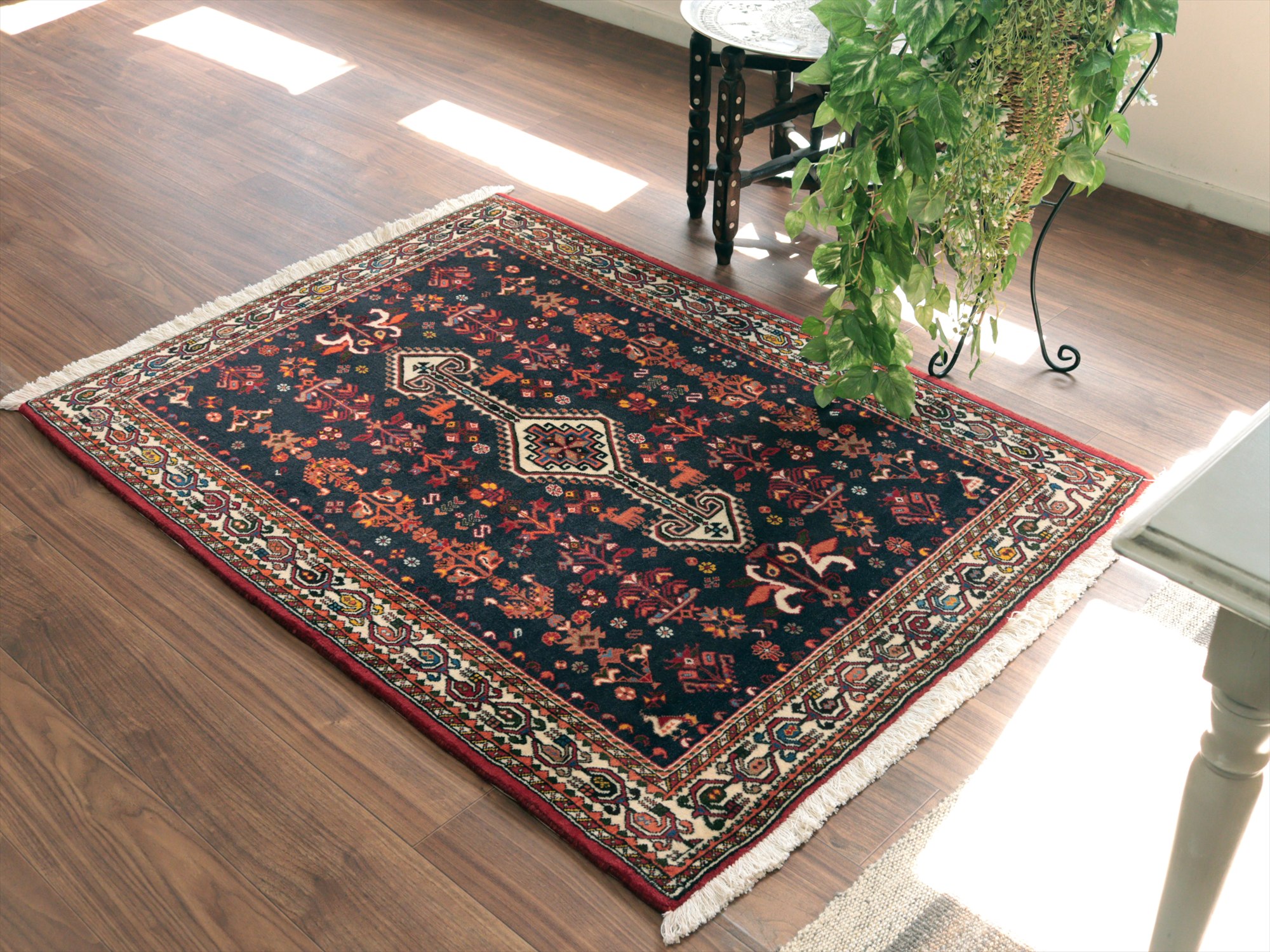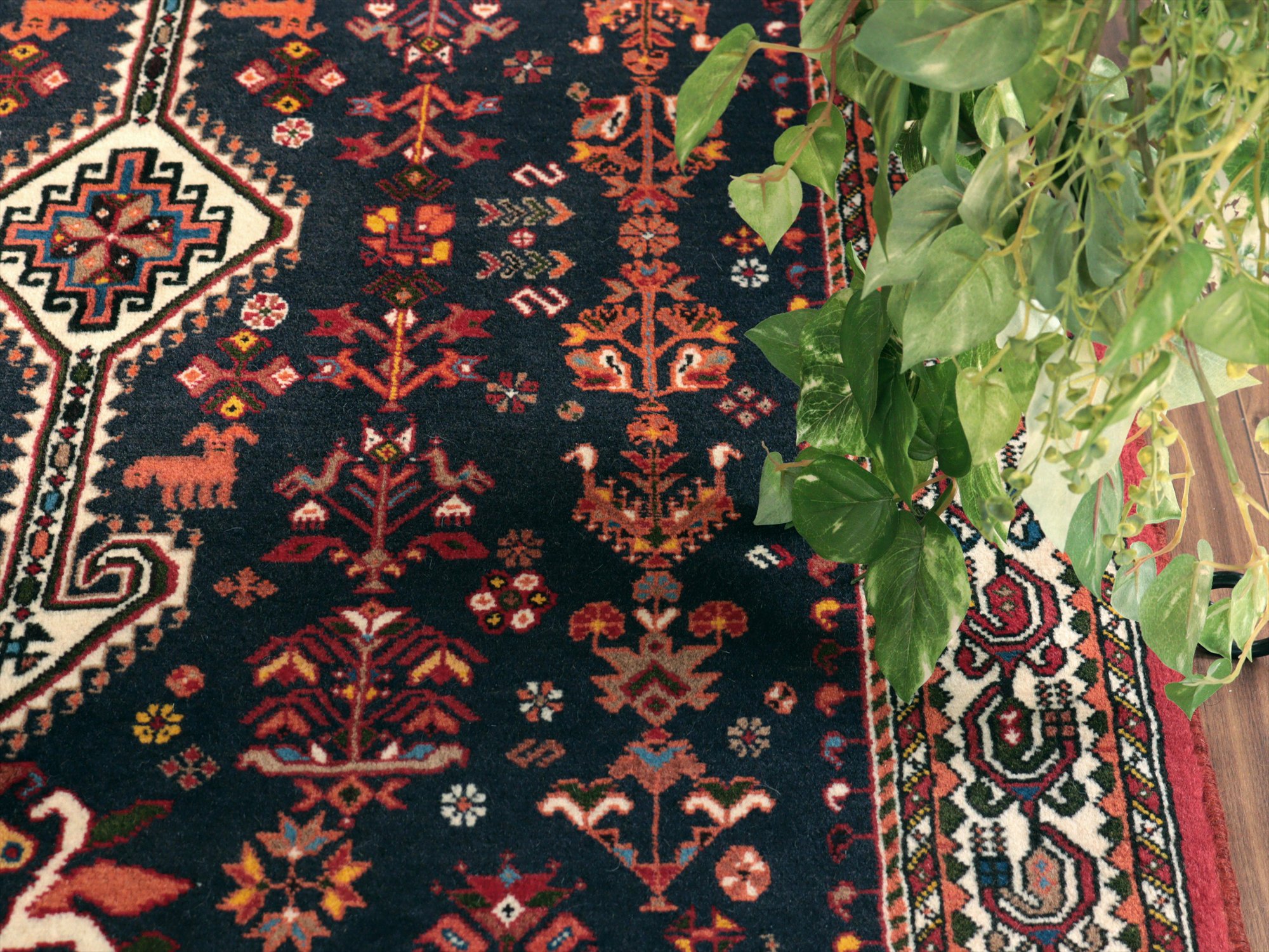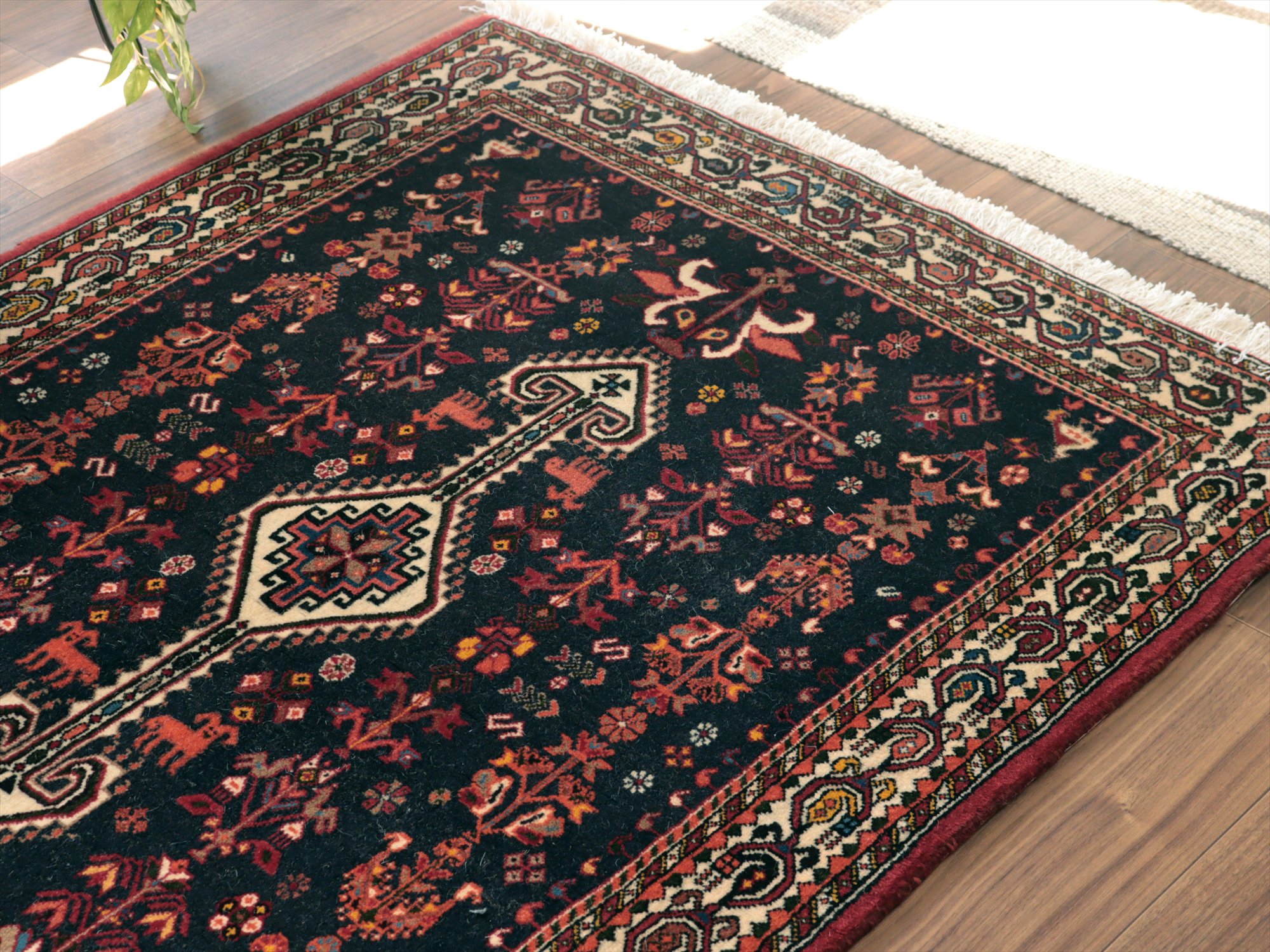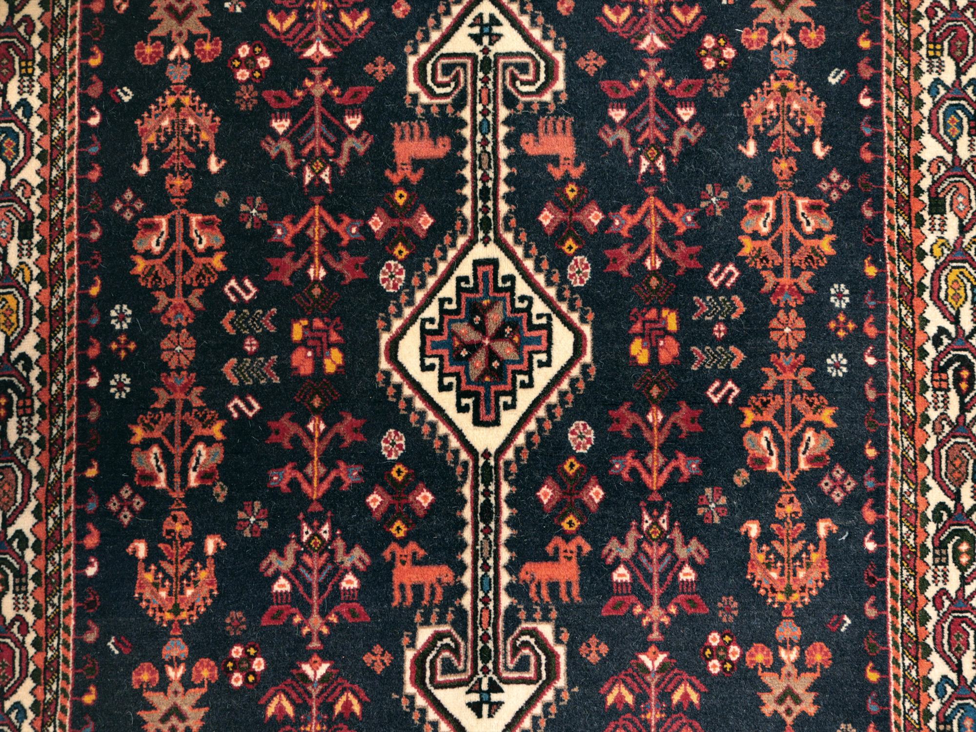 | イランのファルス州北部に位置する都市部、アバディのものとされる絨毯。花や鳥、動物などが明るい色で織られ、黒に近い濃紺のフィールドによく映えています。ボーダー(額縁)部分にはパルメット(植物模様)が連なるように織られ華やかな雰囲気です。 |
