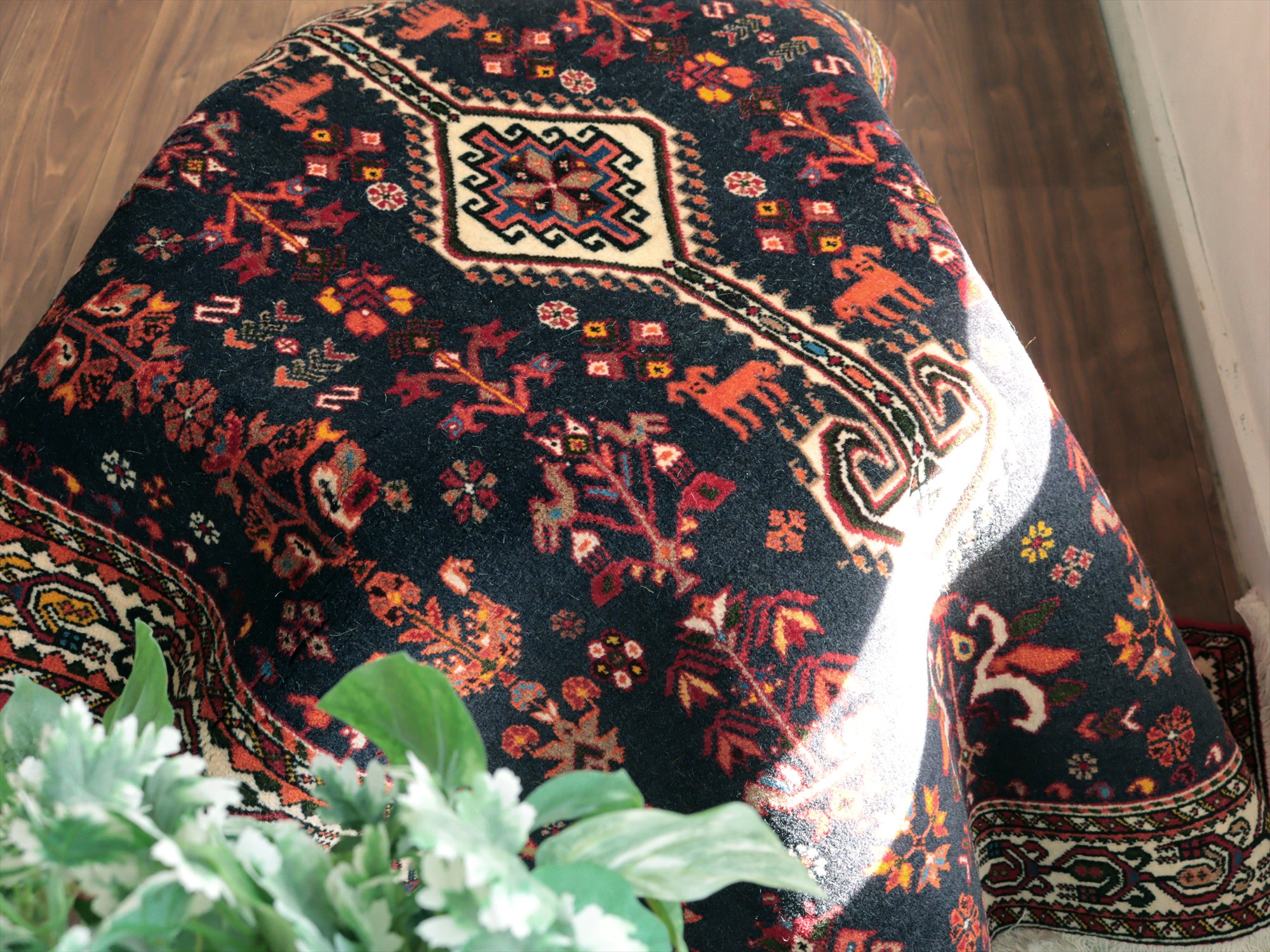 イランの手織りラグ 花と動物141×105cm ネイビー 部族絨毯