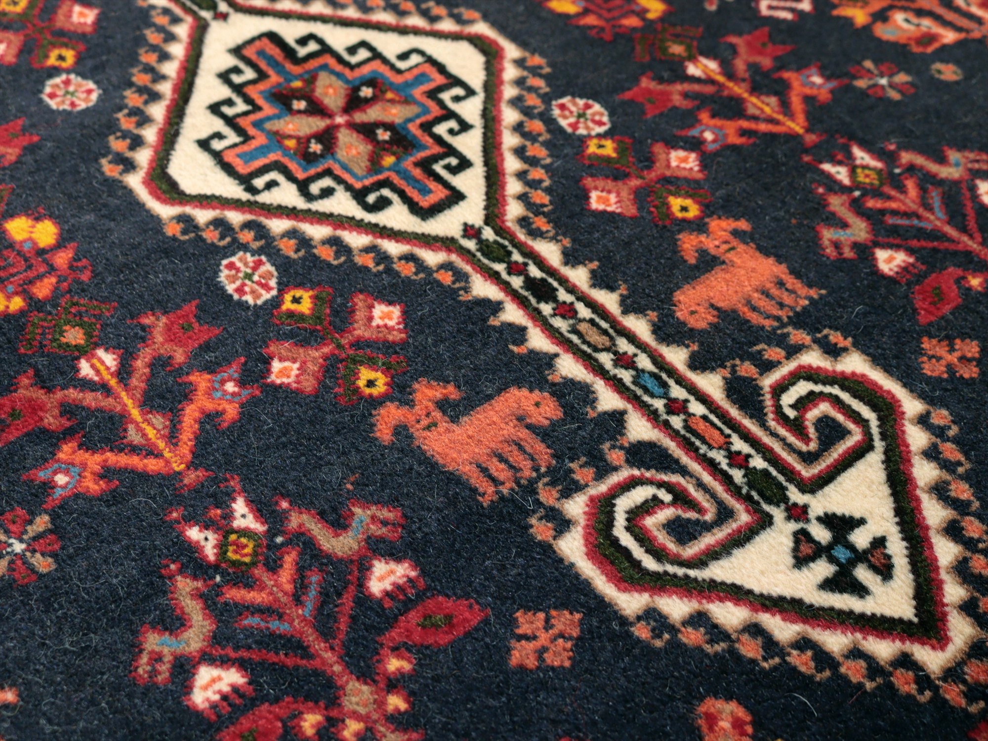 - イランの手織りラグ 花と動物141×105cm ネイビー 部族絨毯
