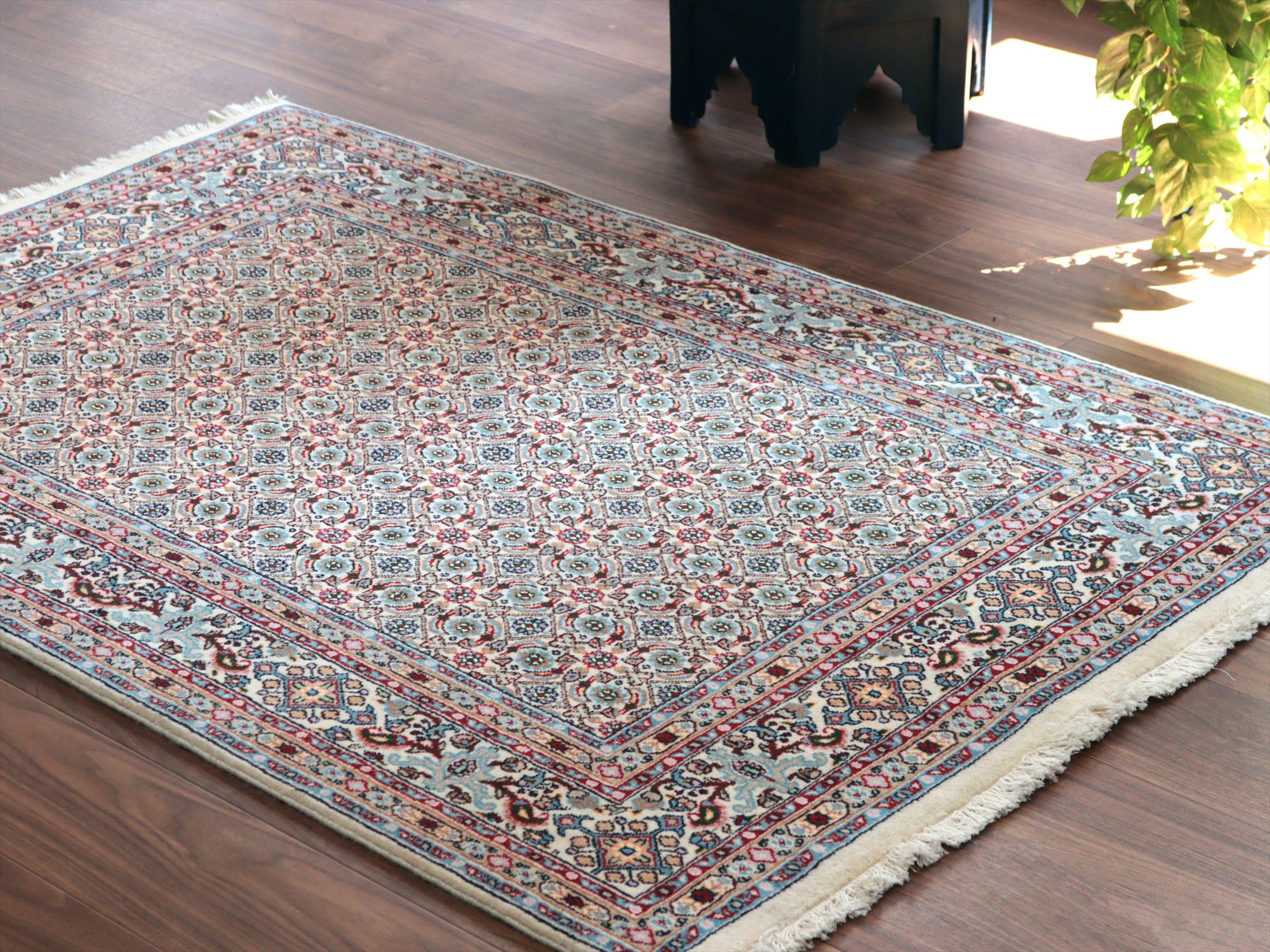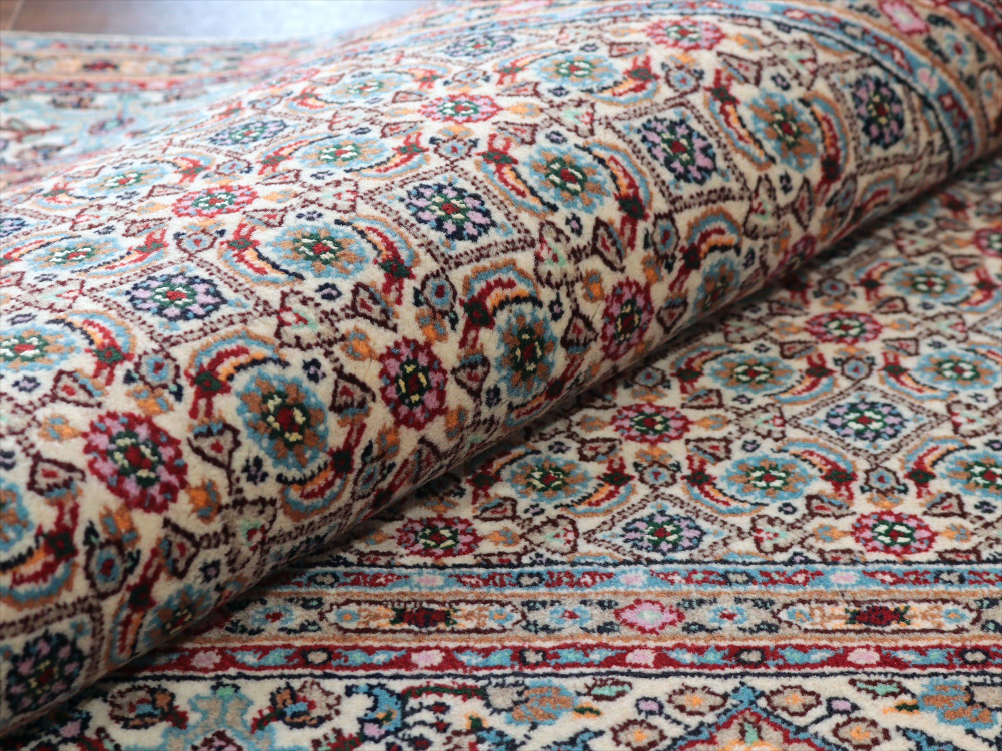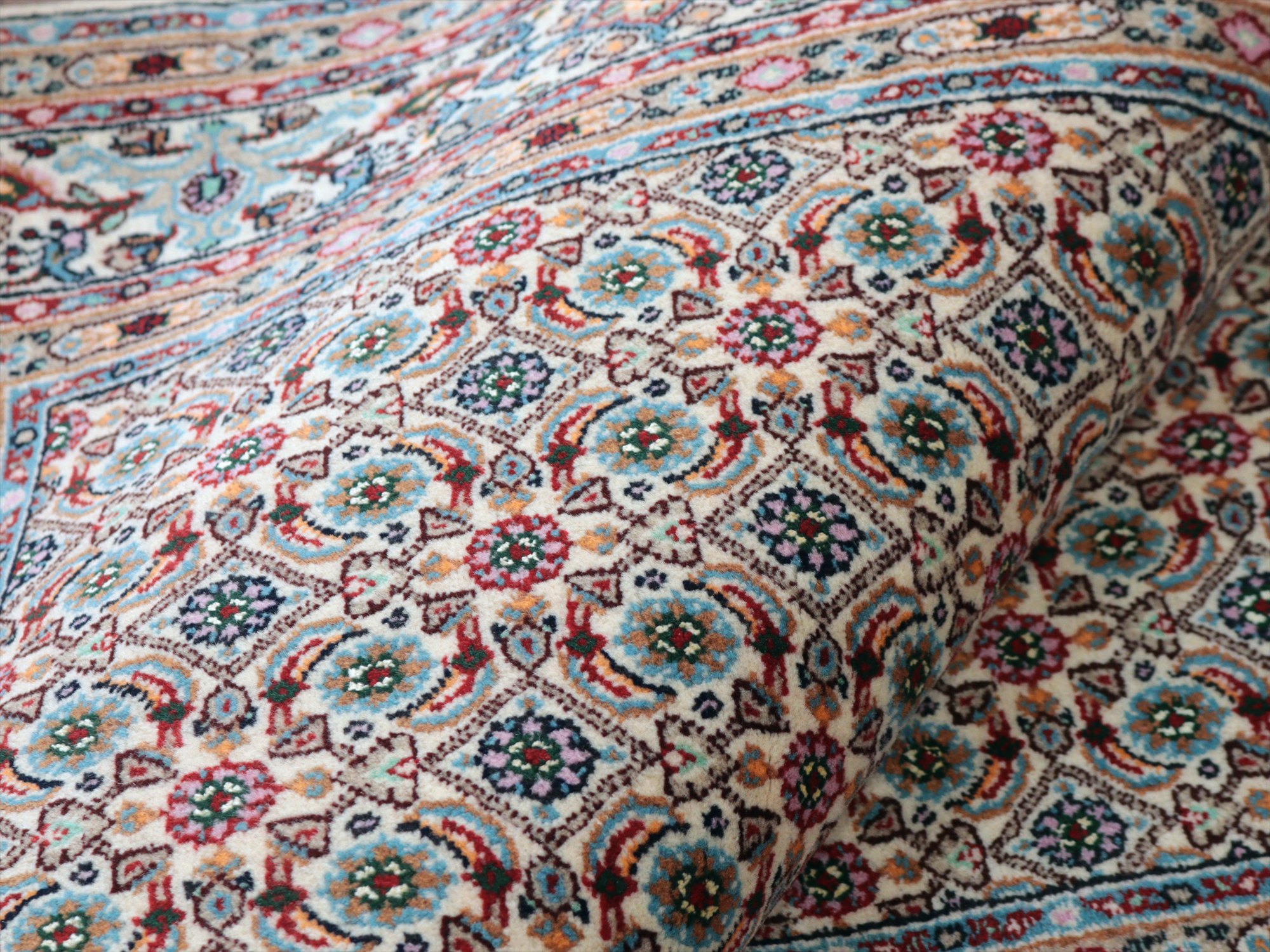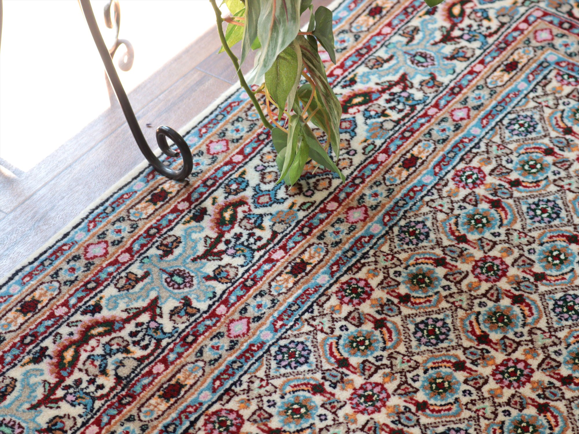 | アイボリーをベースに、主にグリーンの色糸を使い細かな小花文様が織り込まれたムード産の手織り絨毯。イラン東部からアフガニスタンにも一般に見られるヘラート文様で、小さな花びらの形はマヒ(魚)と表現されることもあります。 |