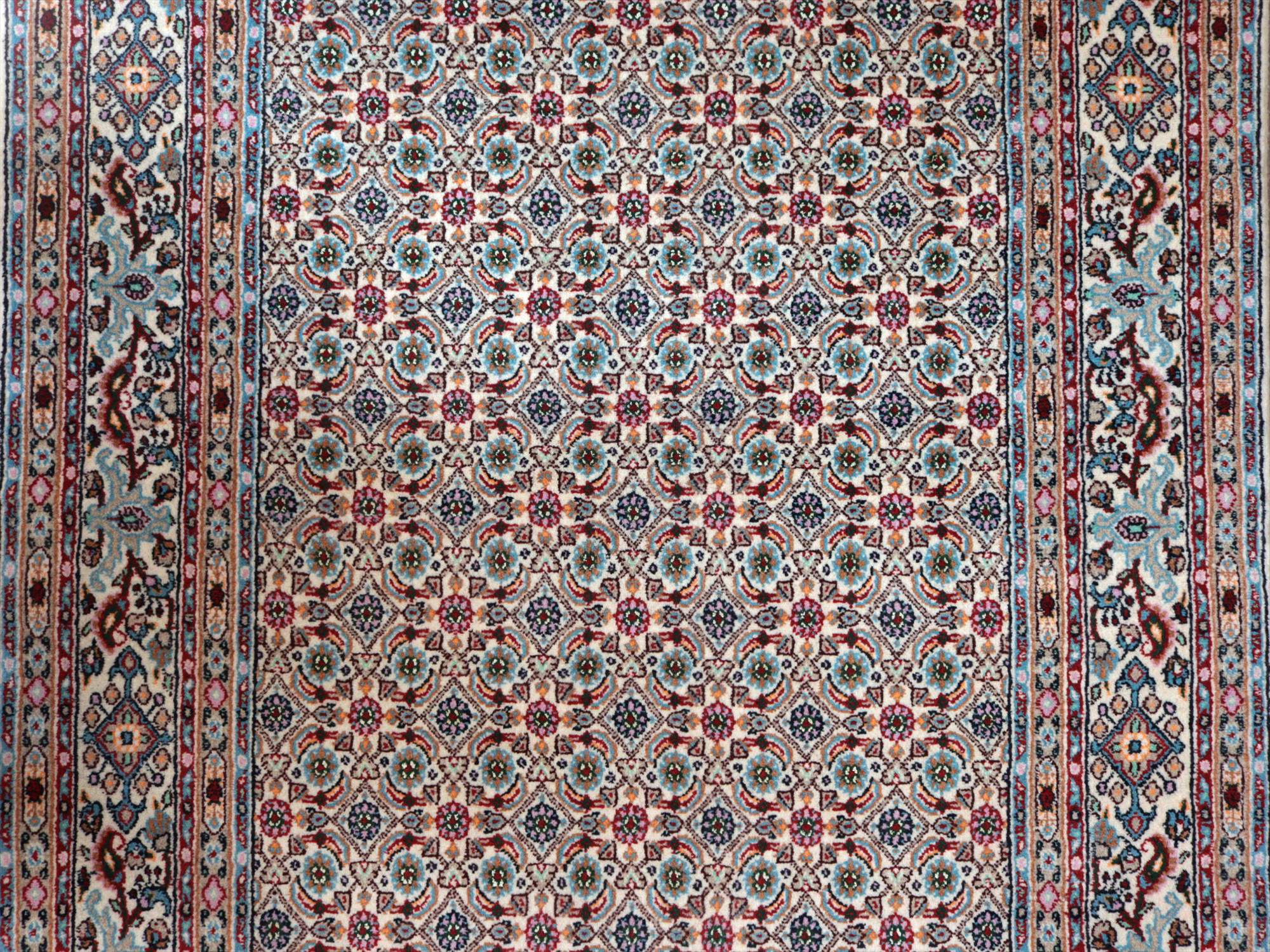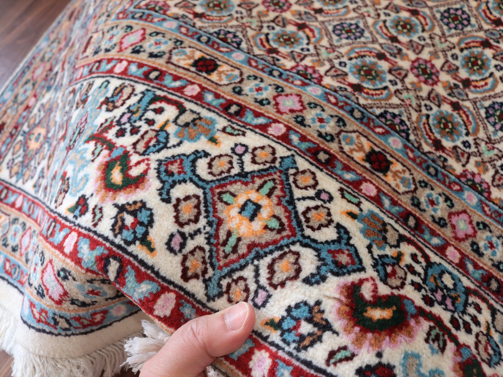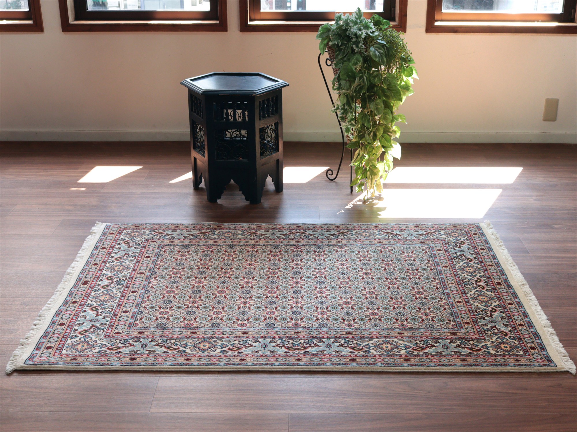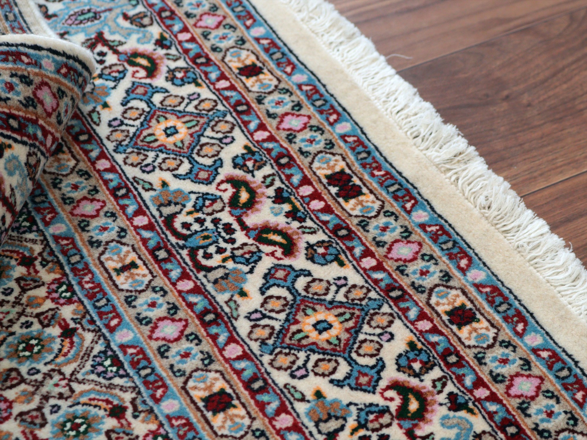 | アイボリーをベースに、主にグリーンの色糸を使い細かな小花文様が織り込まれたムード産の手織り絨毯。イラン東部からアフガニスタンにも一般に見られるヘラート文様で、小さな花びらの形はマヒ(魚)と表現されることもあります。 |