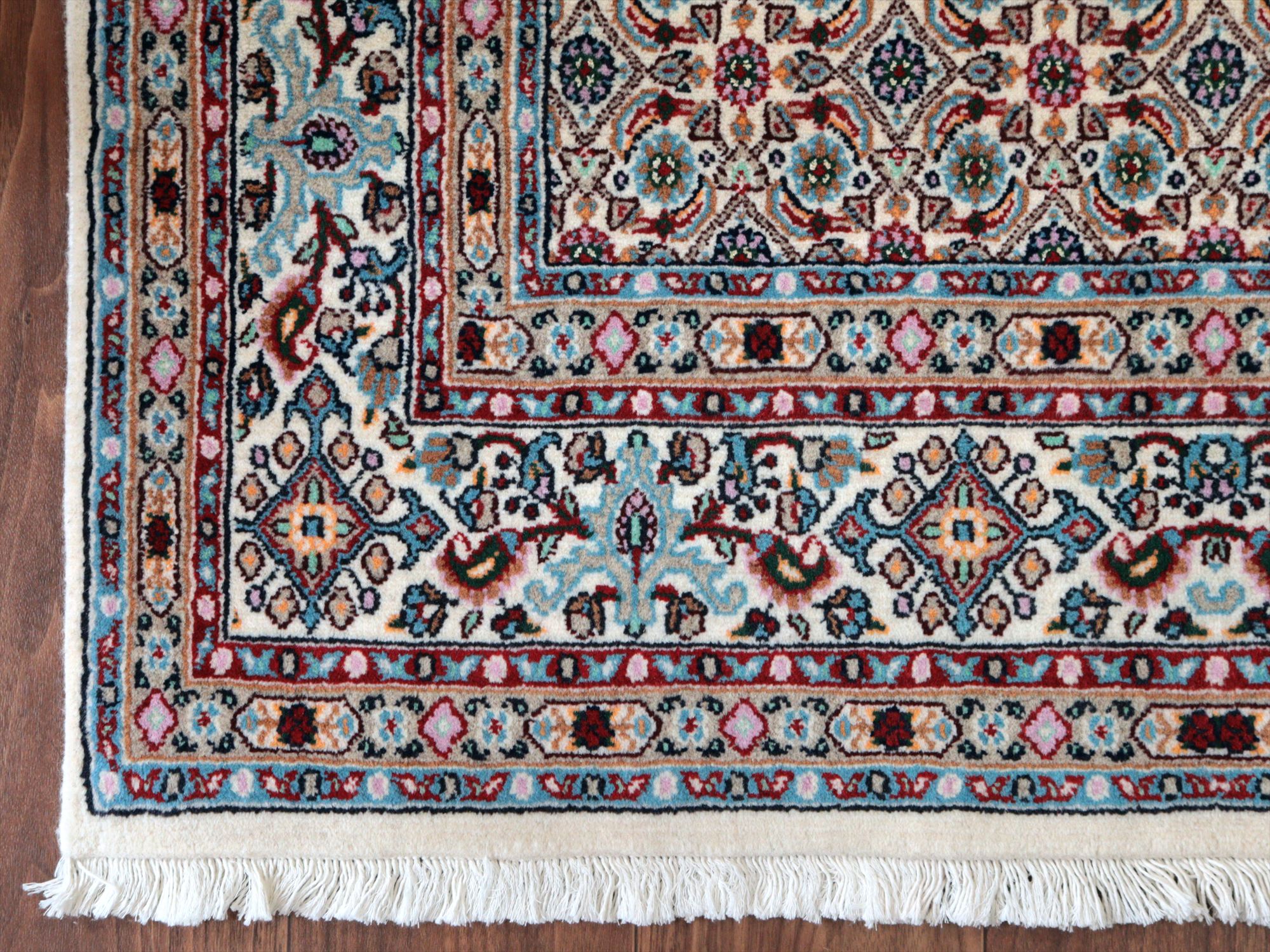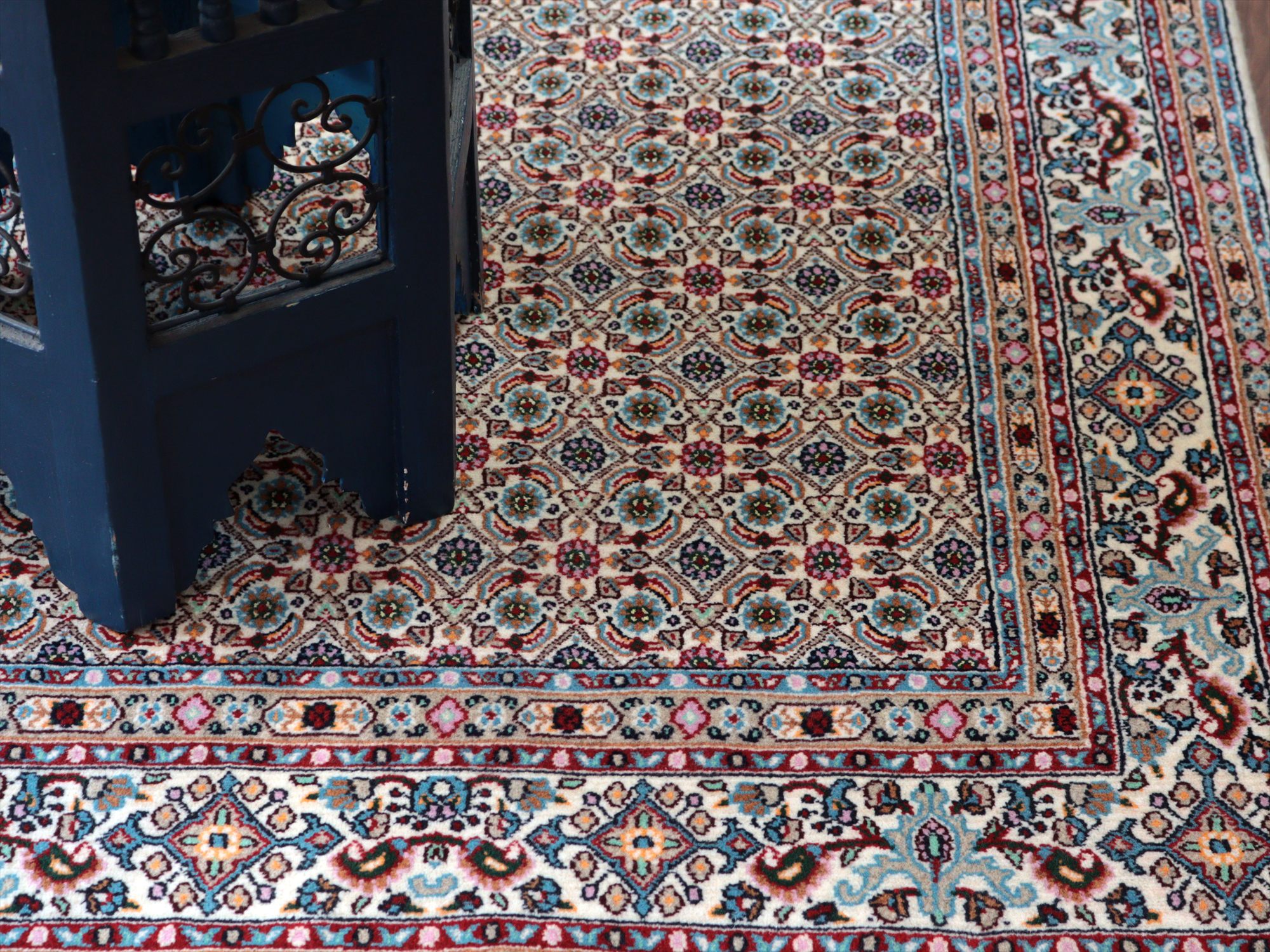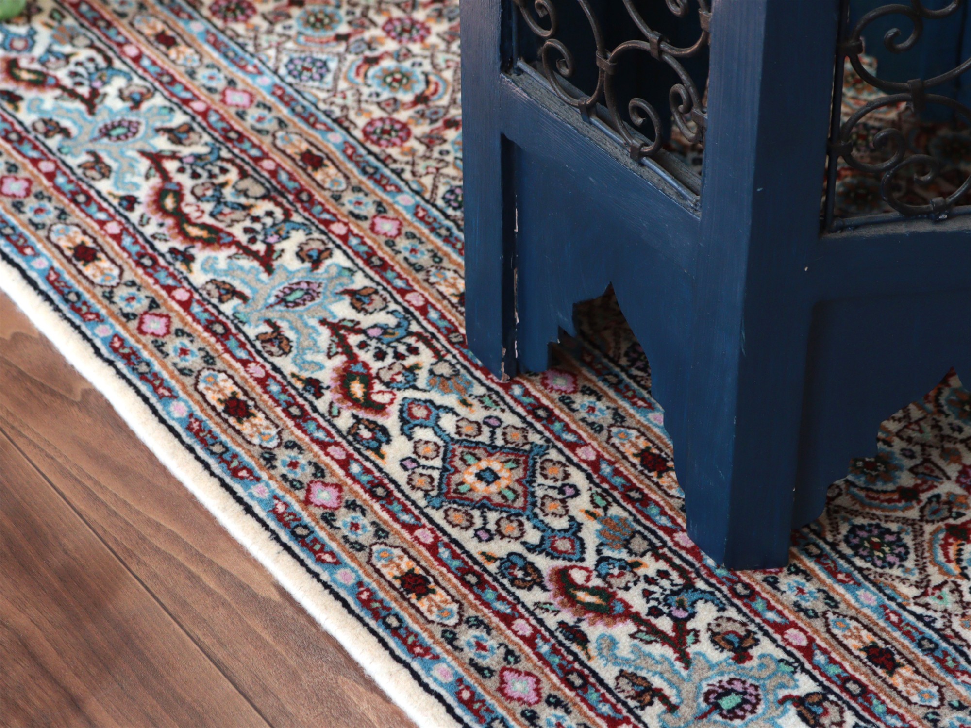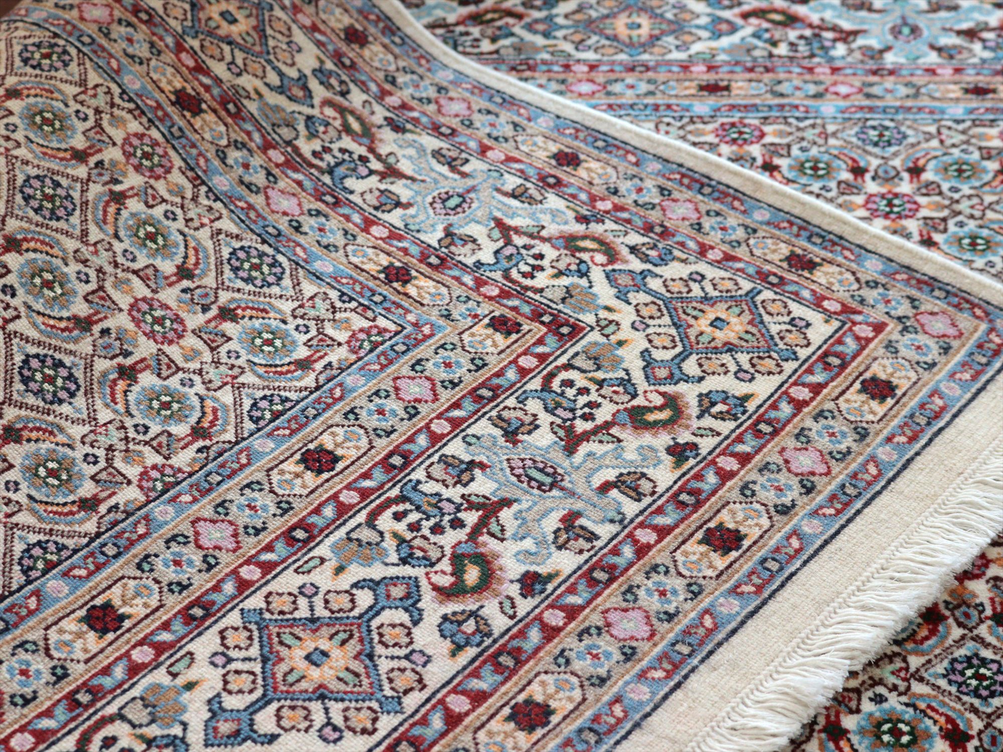 | アイボリーをベースに、主にグリーンの色糸を使い細かな小花文様が織り込まれたムード産の手織り絨毯。イラン東部からアフガニスタンにも一般に見られるヘラート文様で、小さな花びらの形はマヒ(魚)と表現されることもあります。 |
