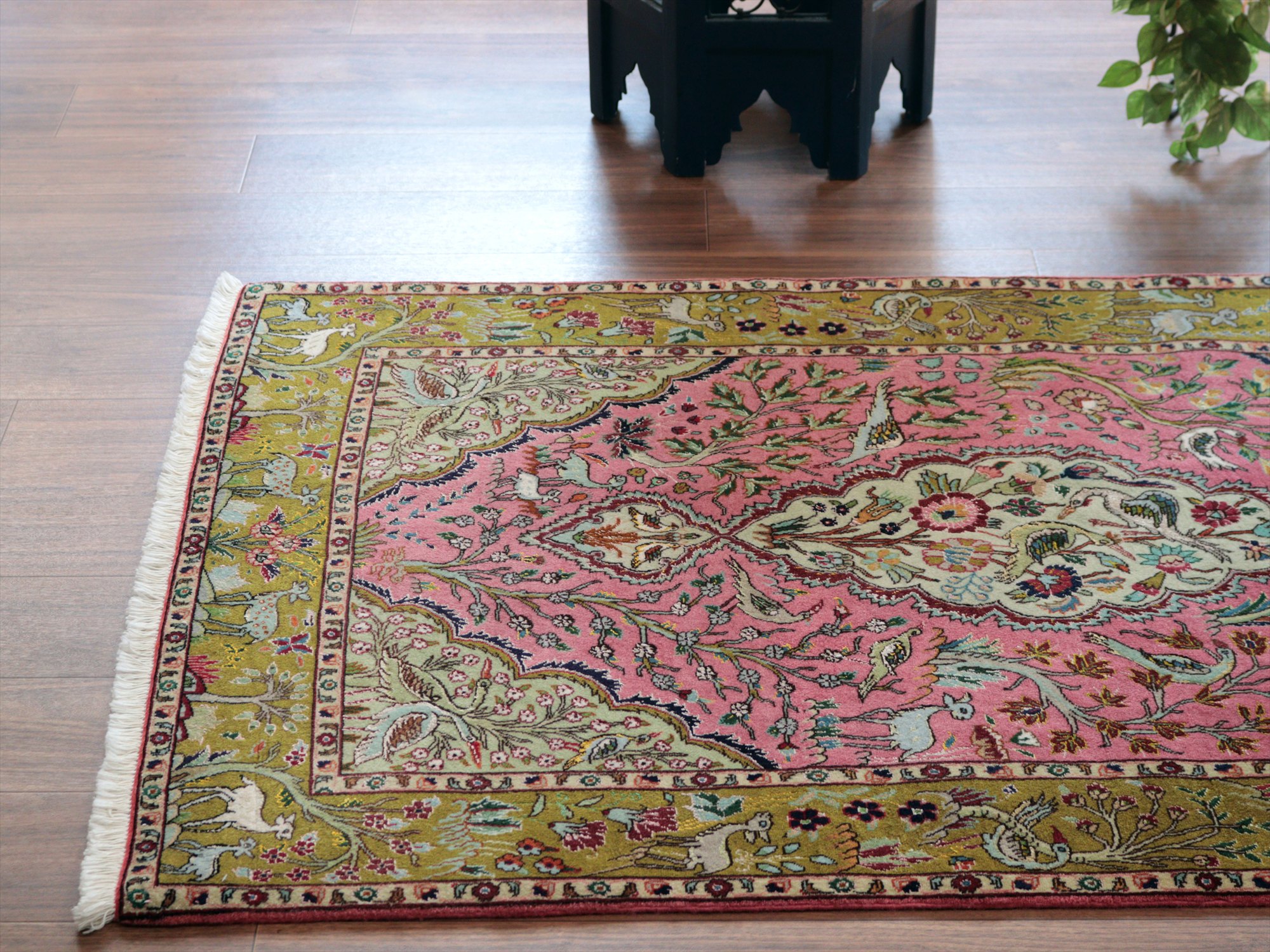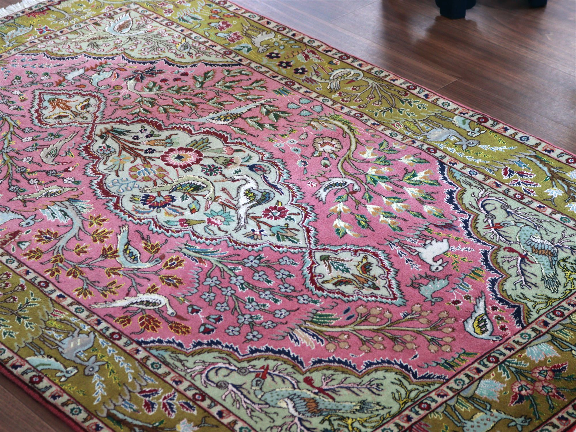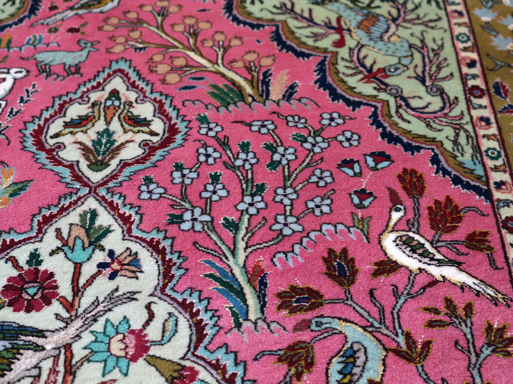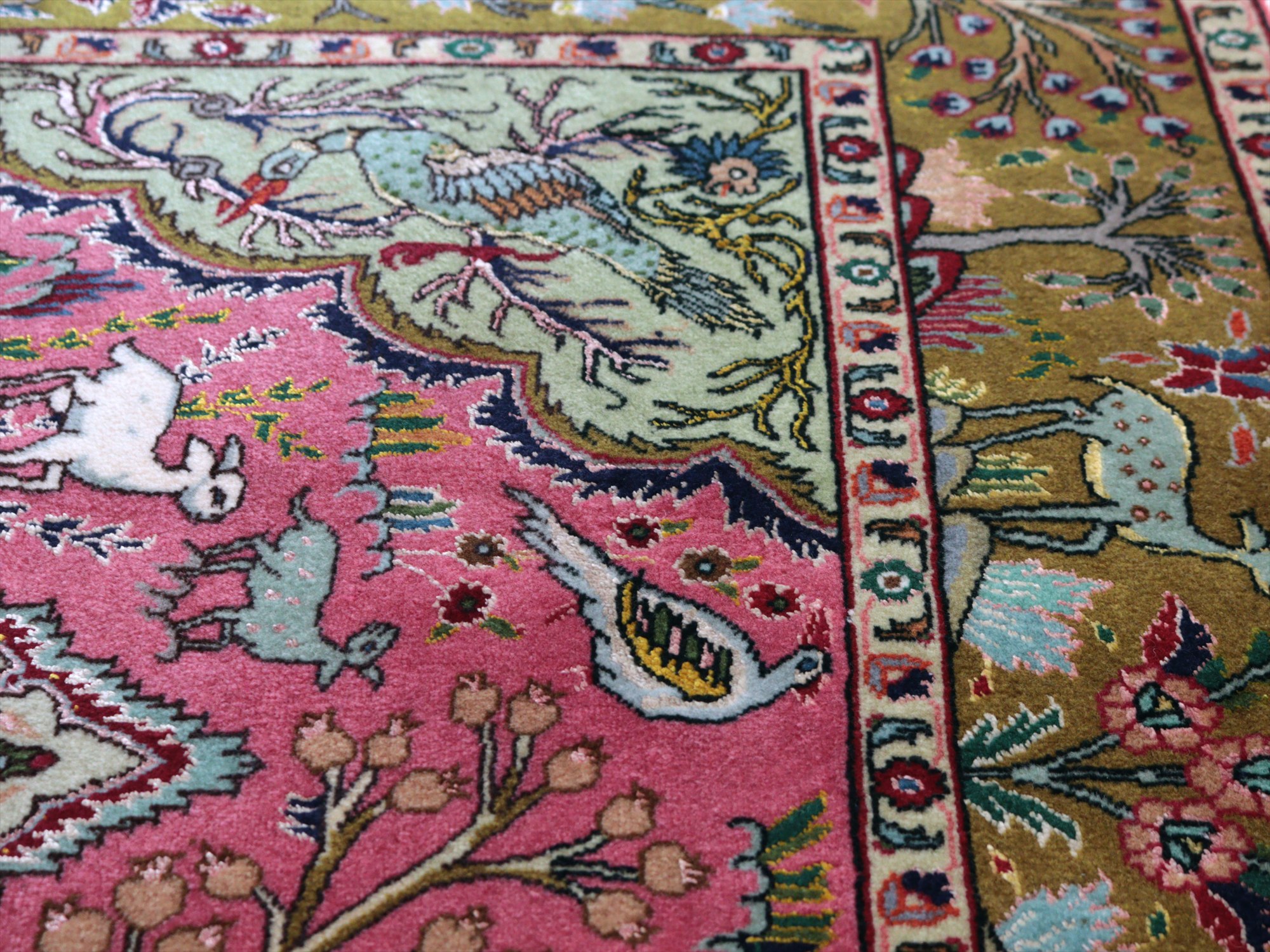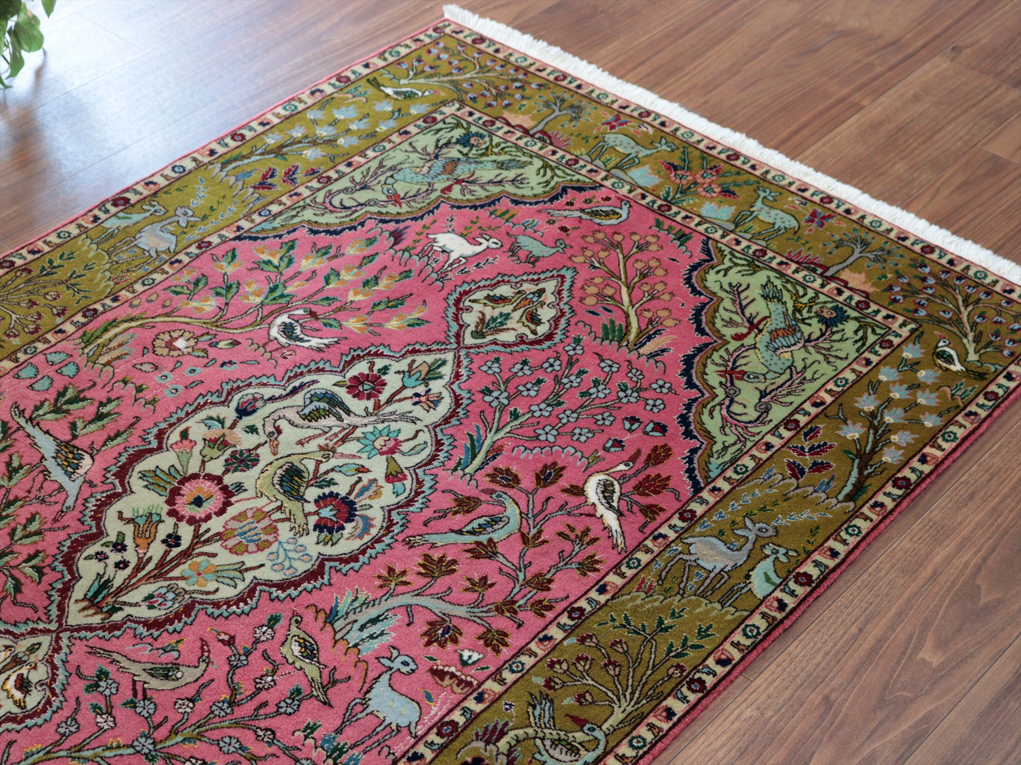 | グリーンと朱色がかったピンクという、ユニークな色の組み合わせで織られたタブリーズ産の絨毯。鳥や動物、植物が曲線を用いて豊かに表現されています。 |