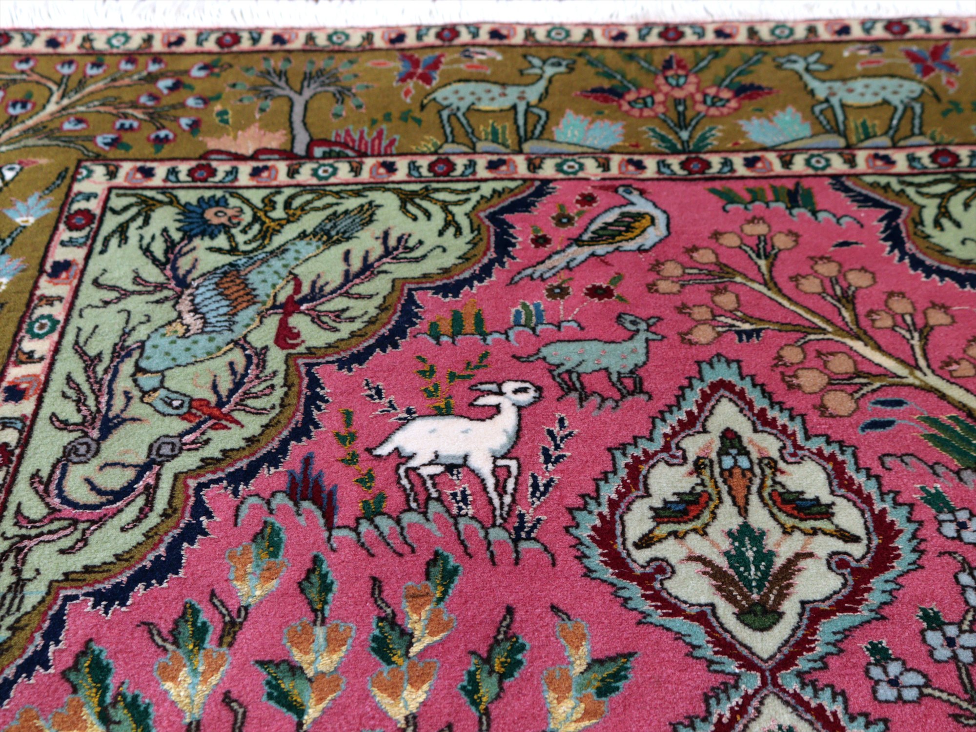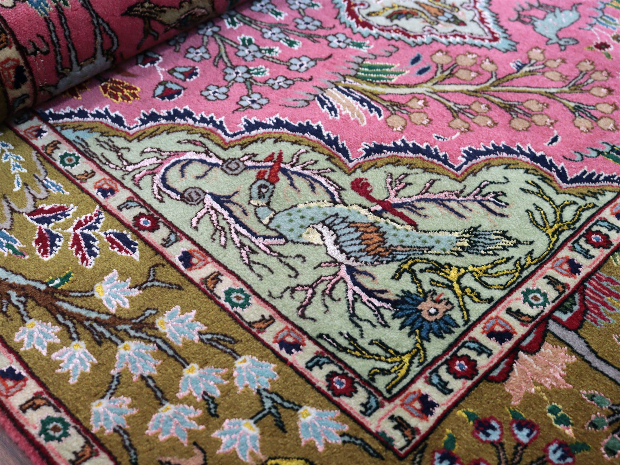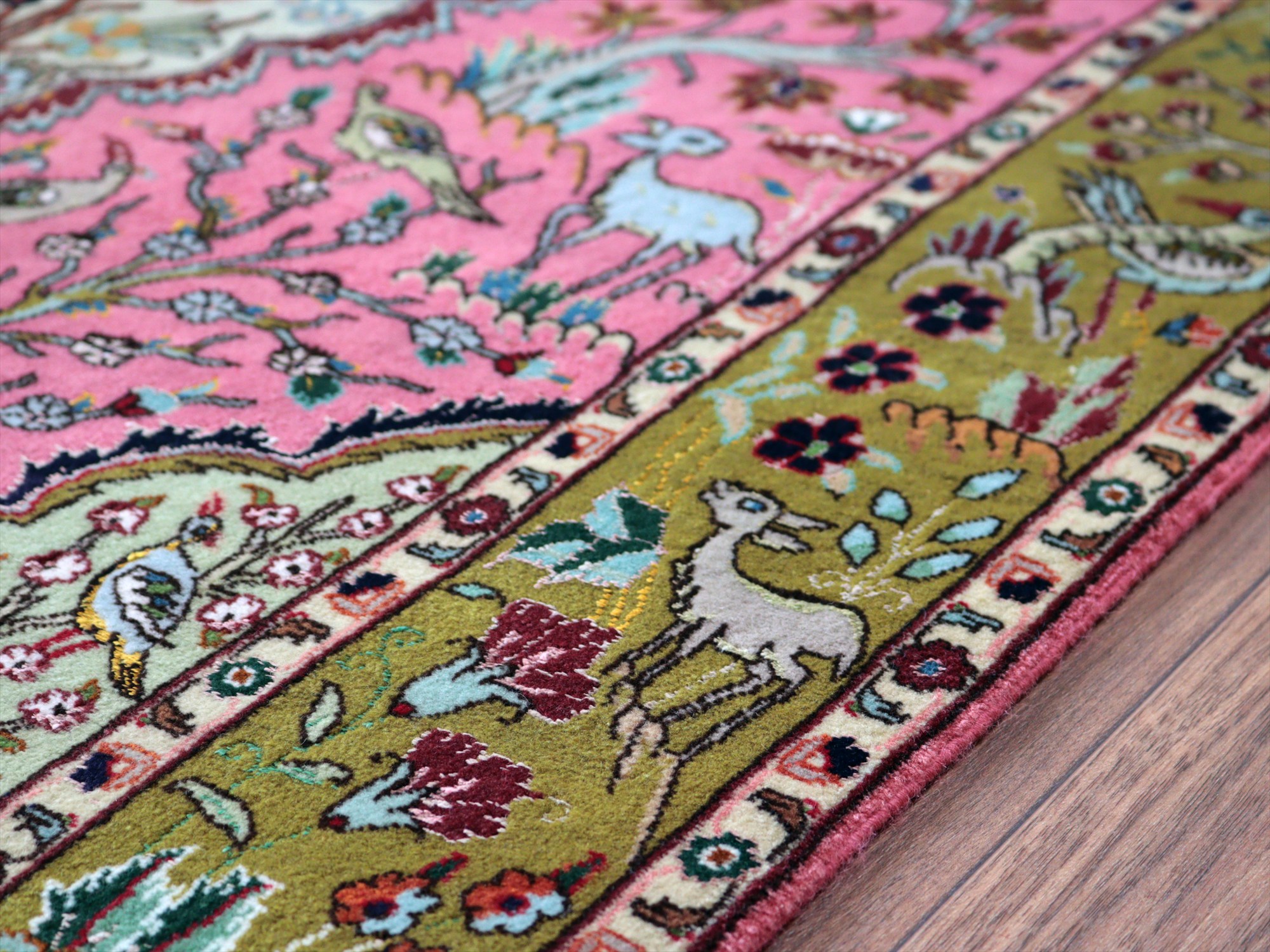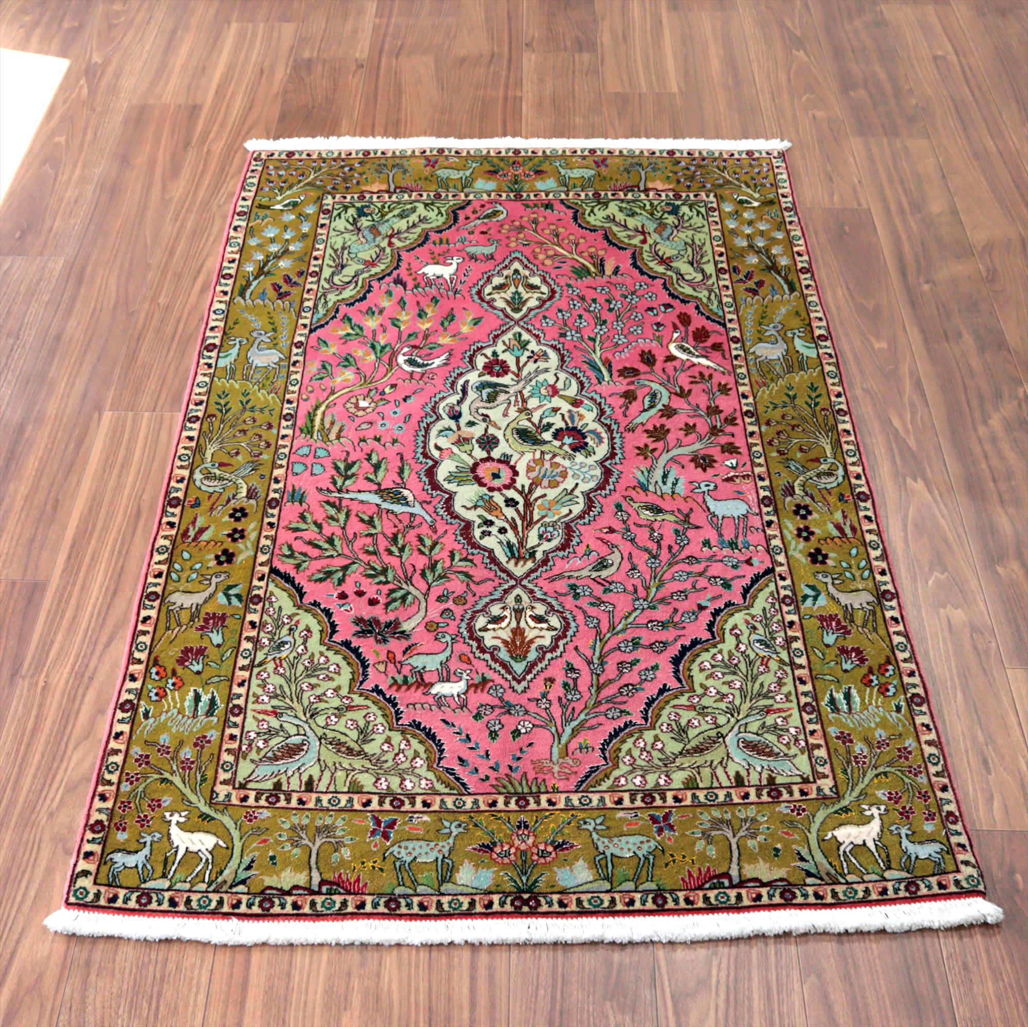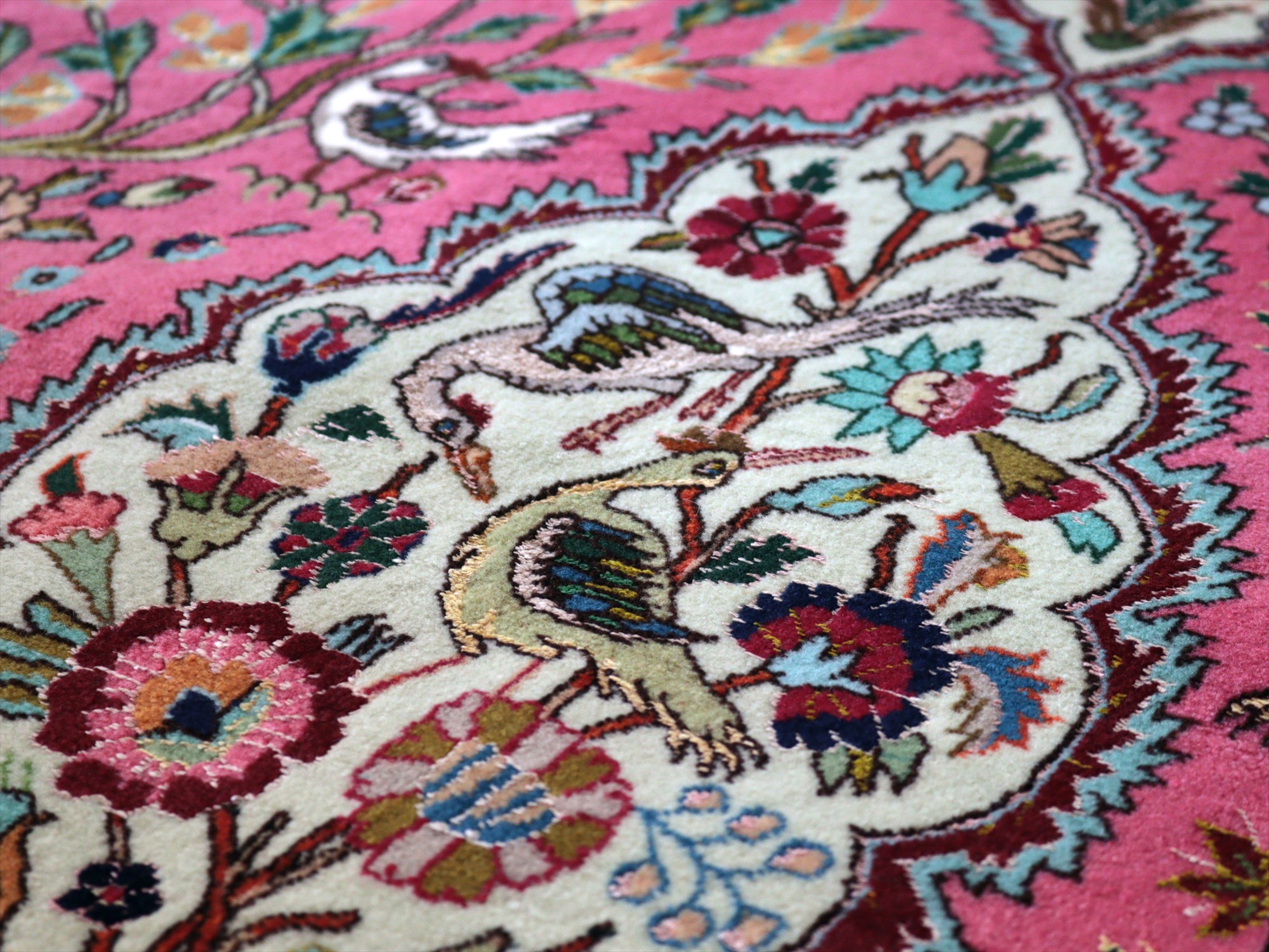| グリーンと朱色がかったピンクという、ユニークな色の組み合わせで織られたタブリーズ産の絨毯。鳥や動物、植物が曲線を用いて豊かに表現されています。 |