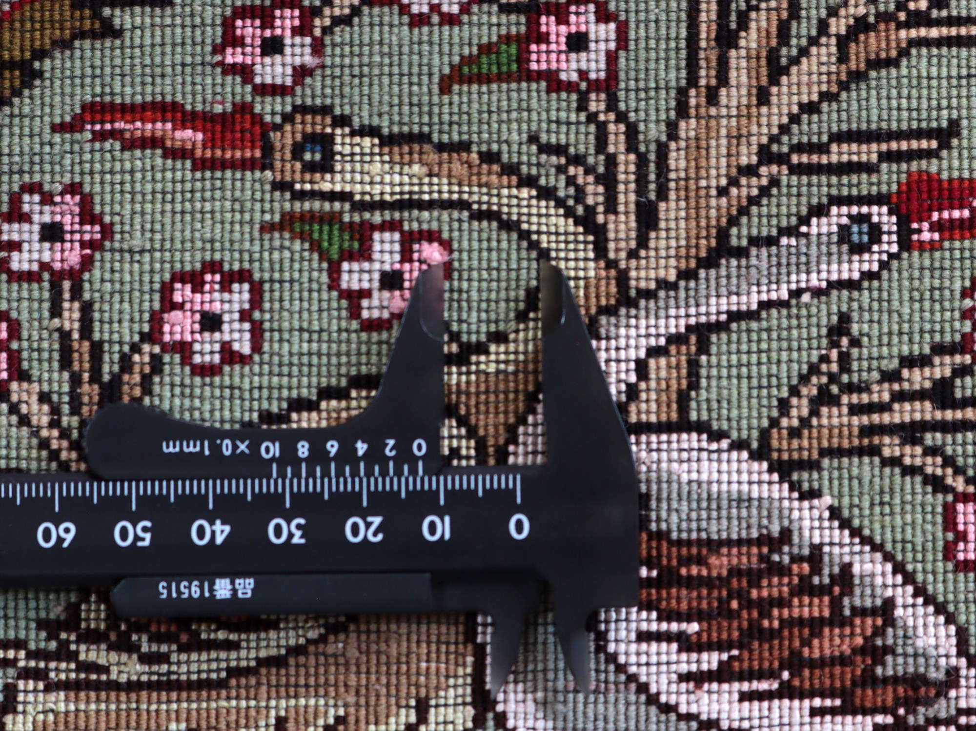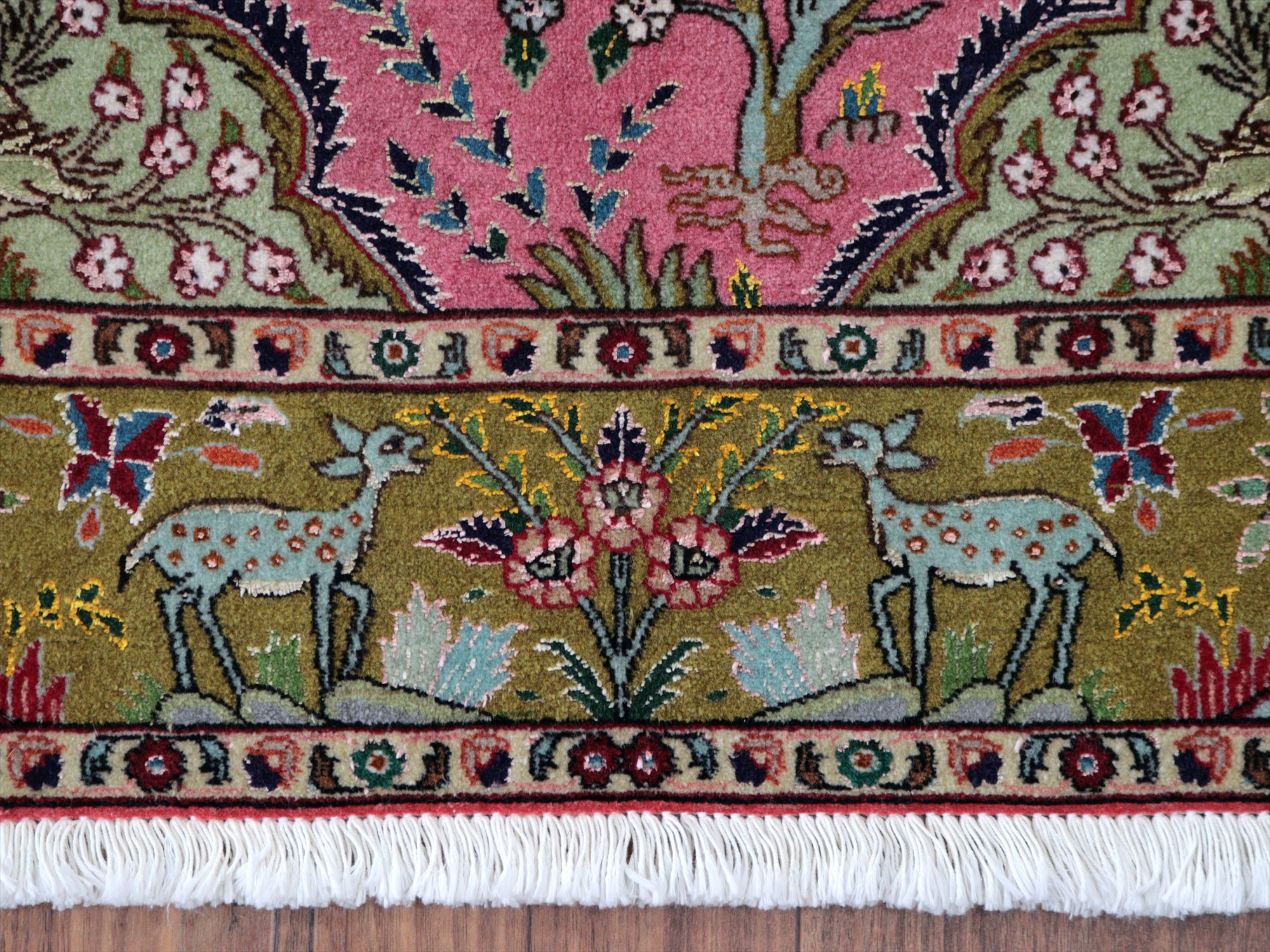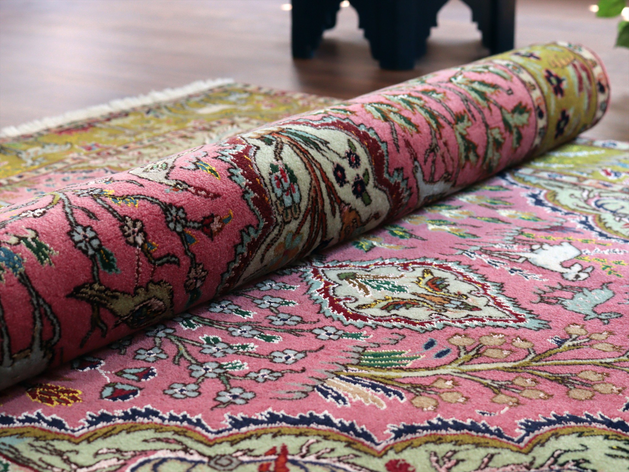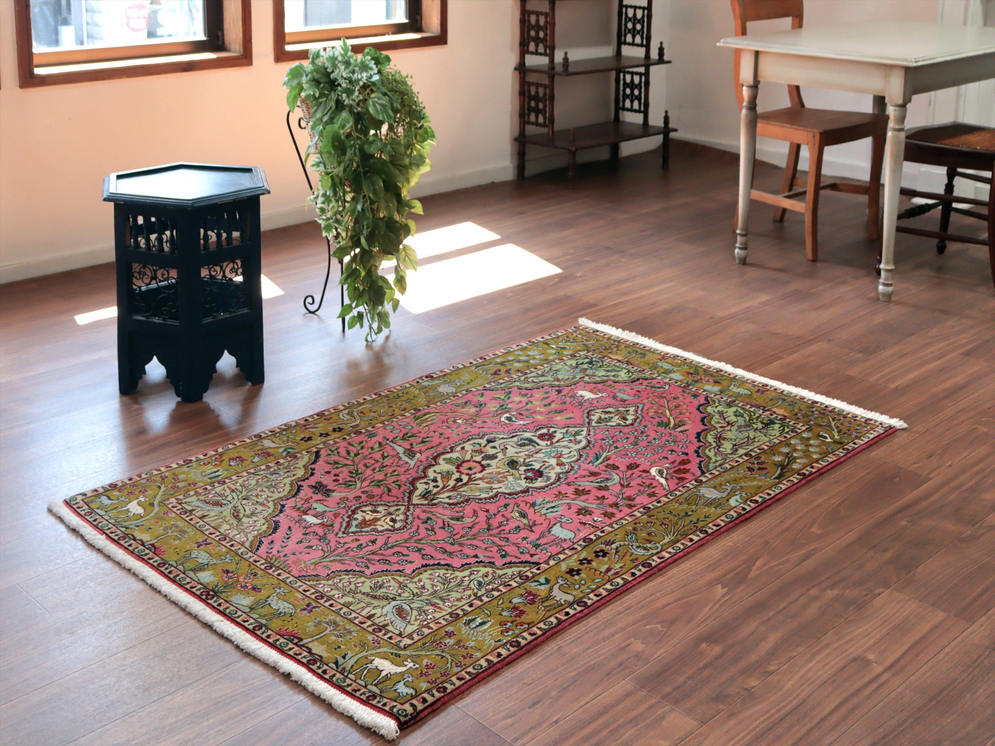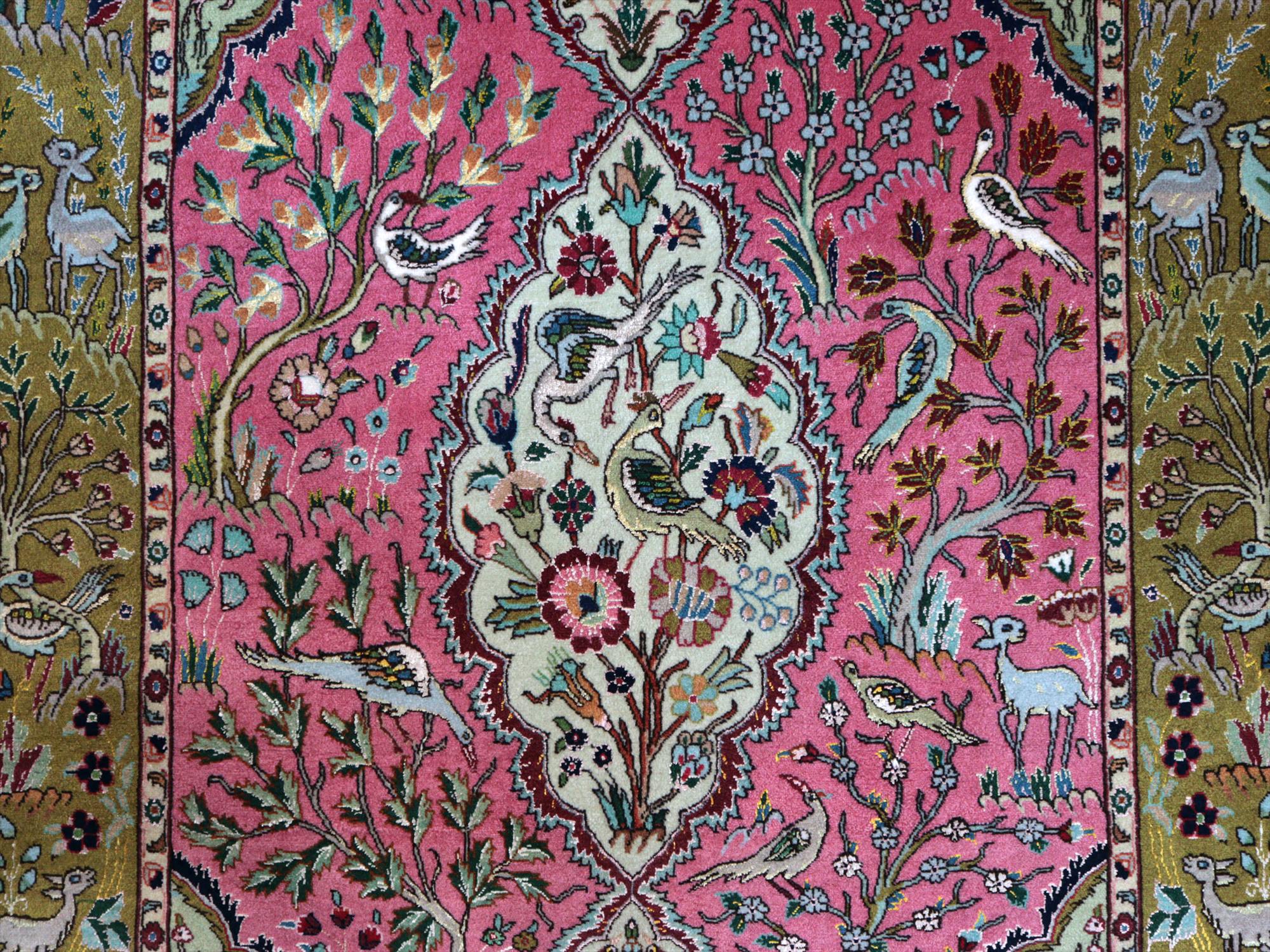 | グリーンと朱色がかったピンクという、ユニークな色の組み合わせで織られたタブリーズ産の絨毯。鳥や動物、植物が曲線を用いて豊かに表現されています。 |