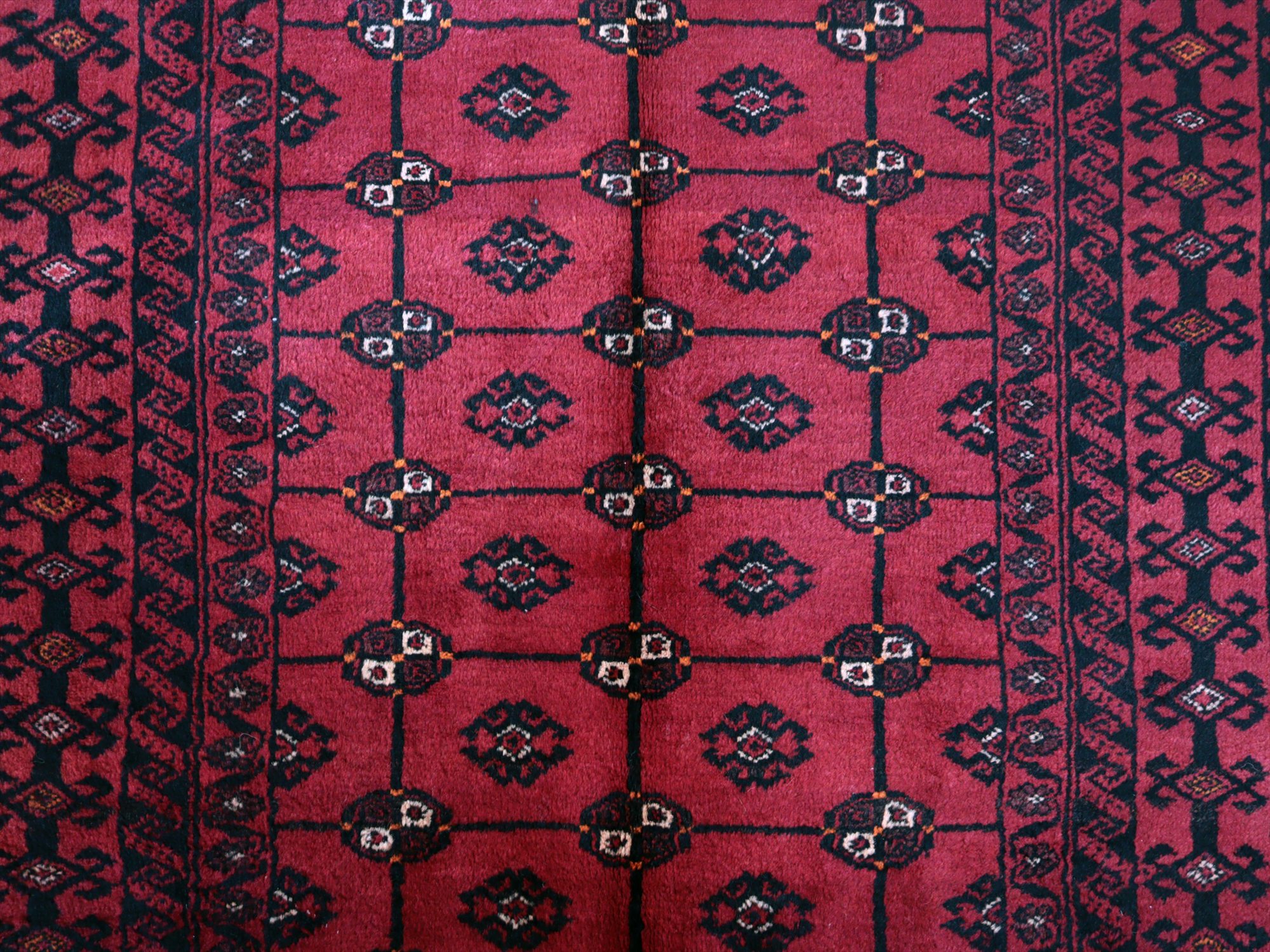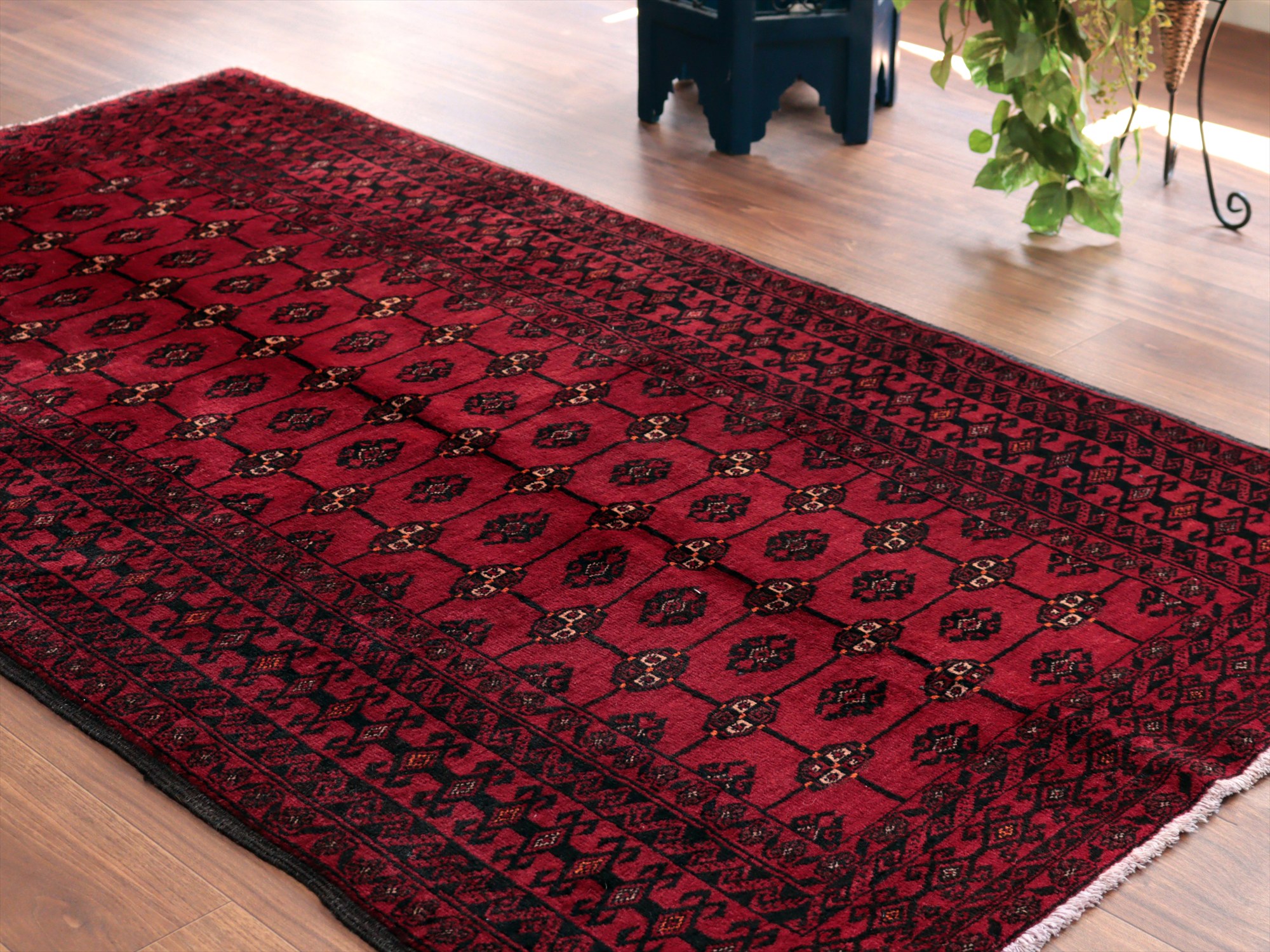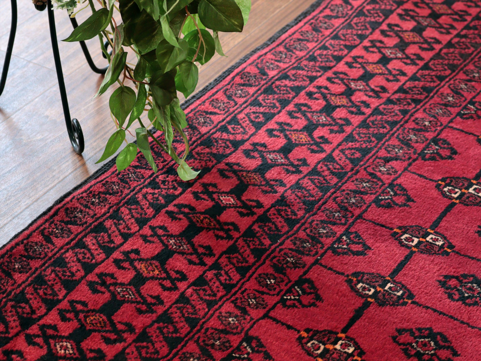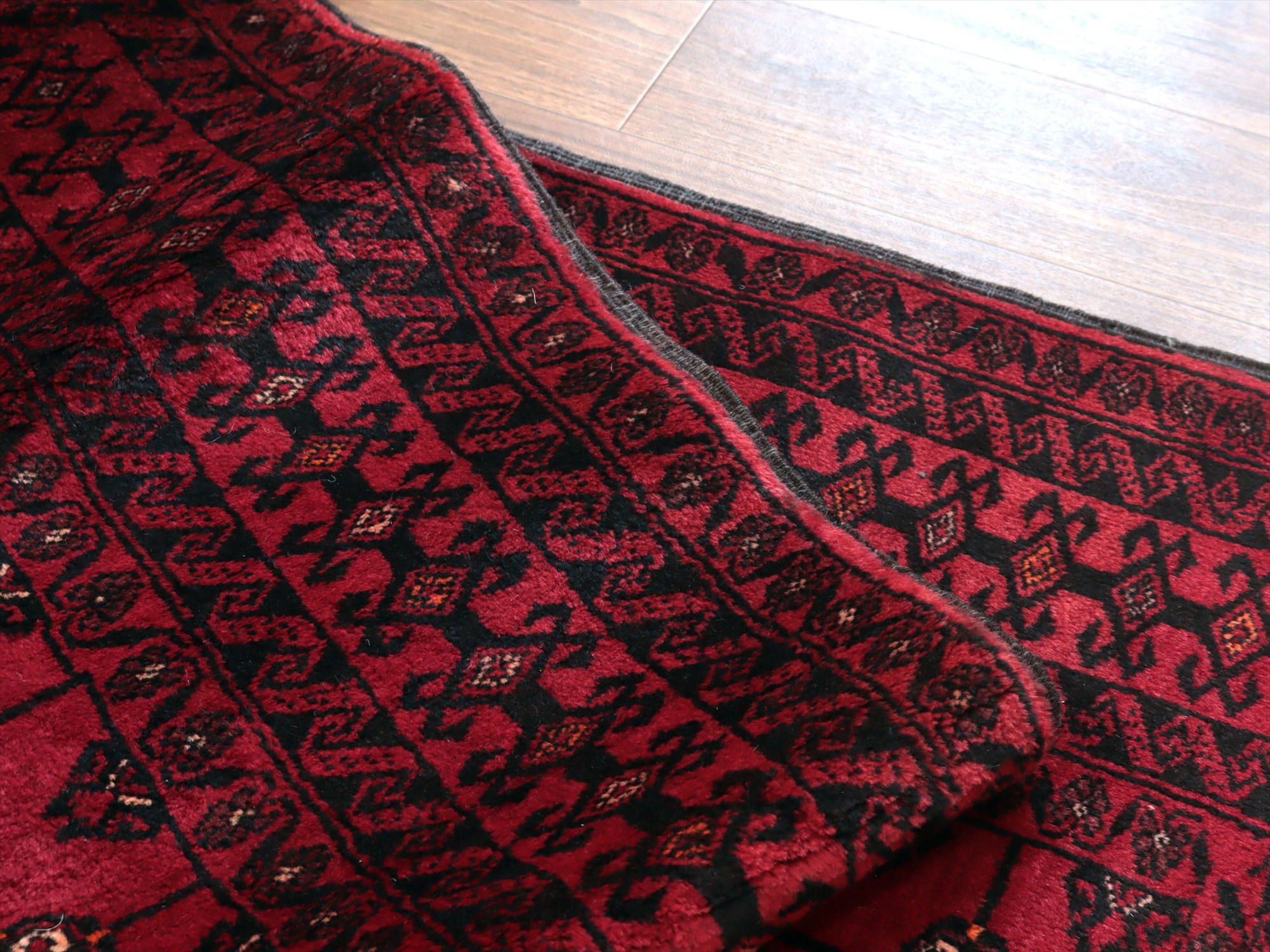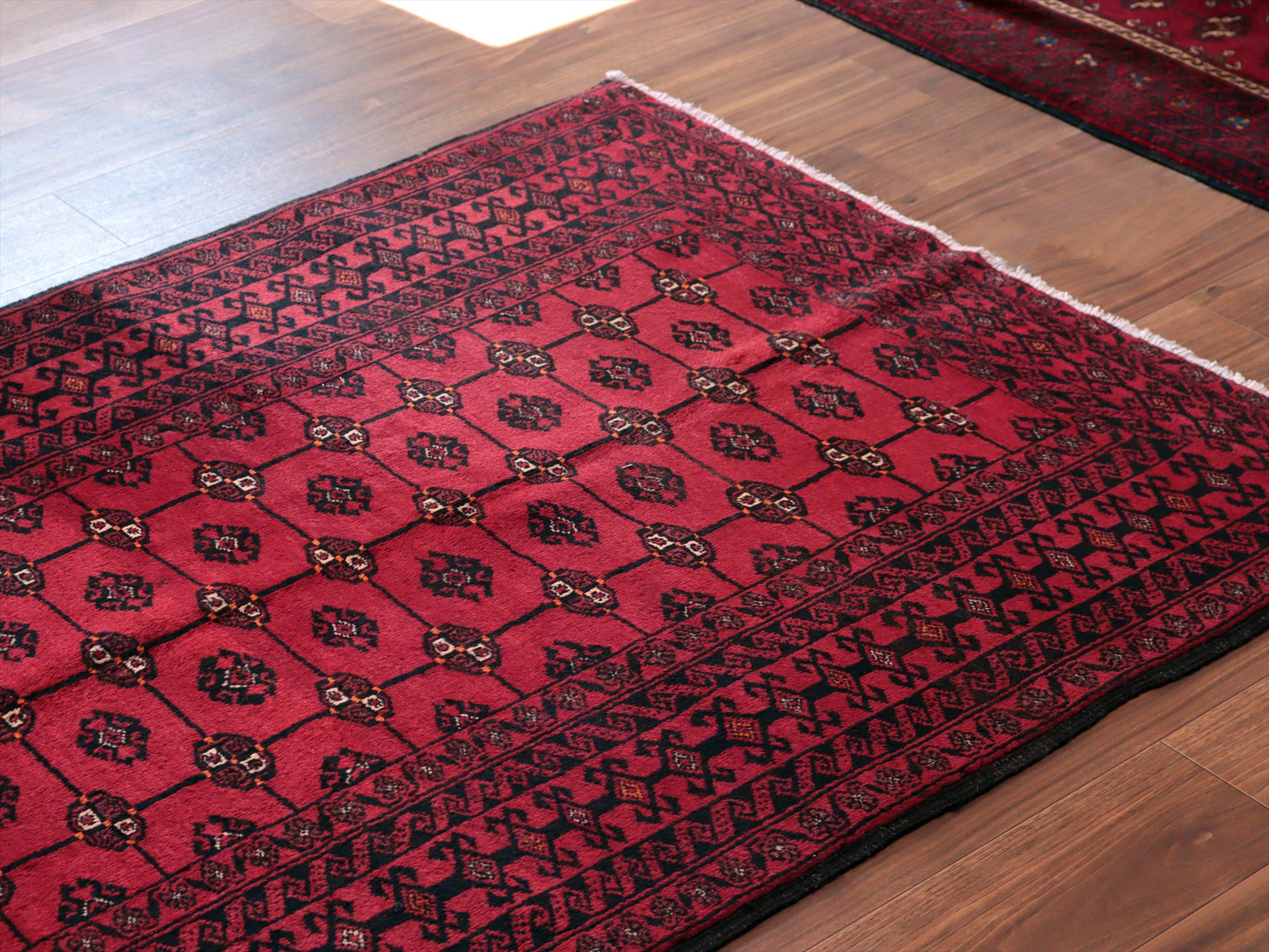 | イラン東部からアフガン・パキスタンなどに住むバルーチ族のカーペット。赤地にギュルのモチーフが入ったバルーチの典型的なデザインです。中央のフィールドには、文様が格子状に並ぶように織られていてクラシカルな雰囲気が良く出ています。 |