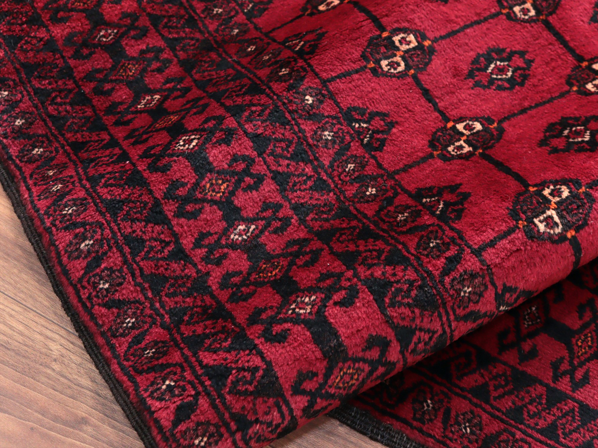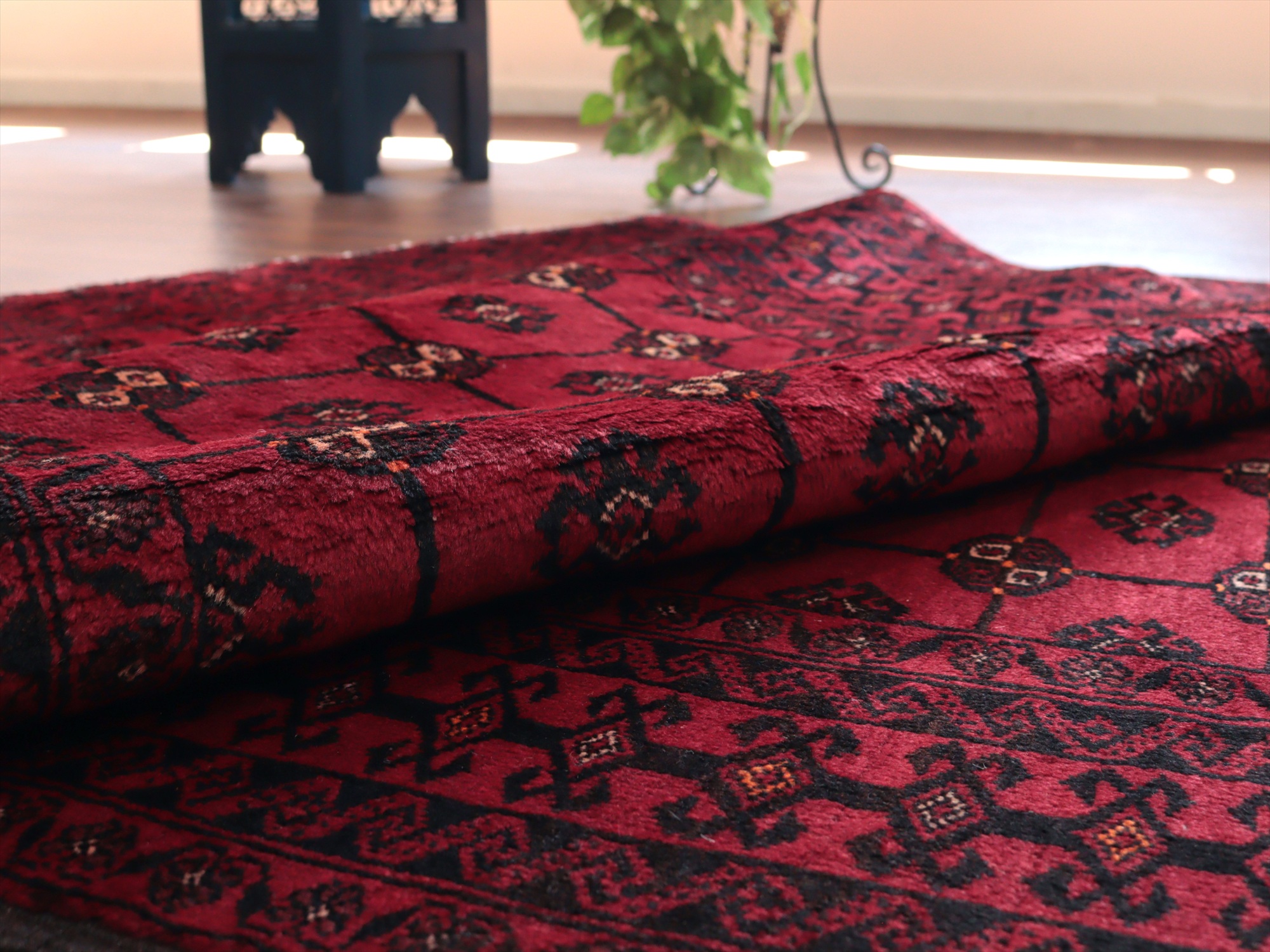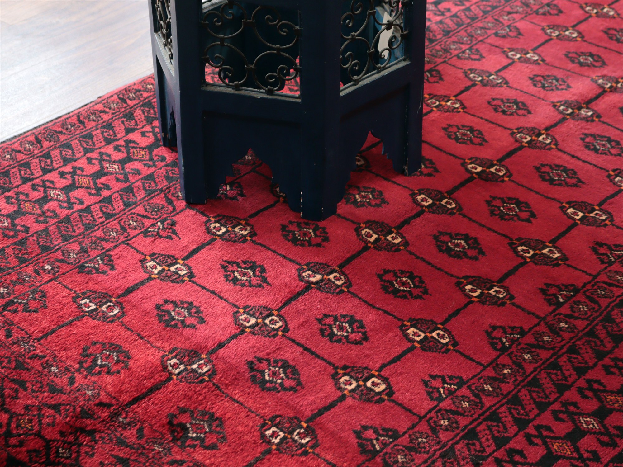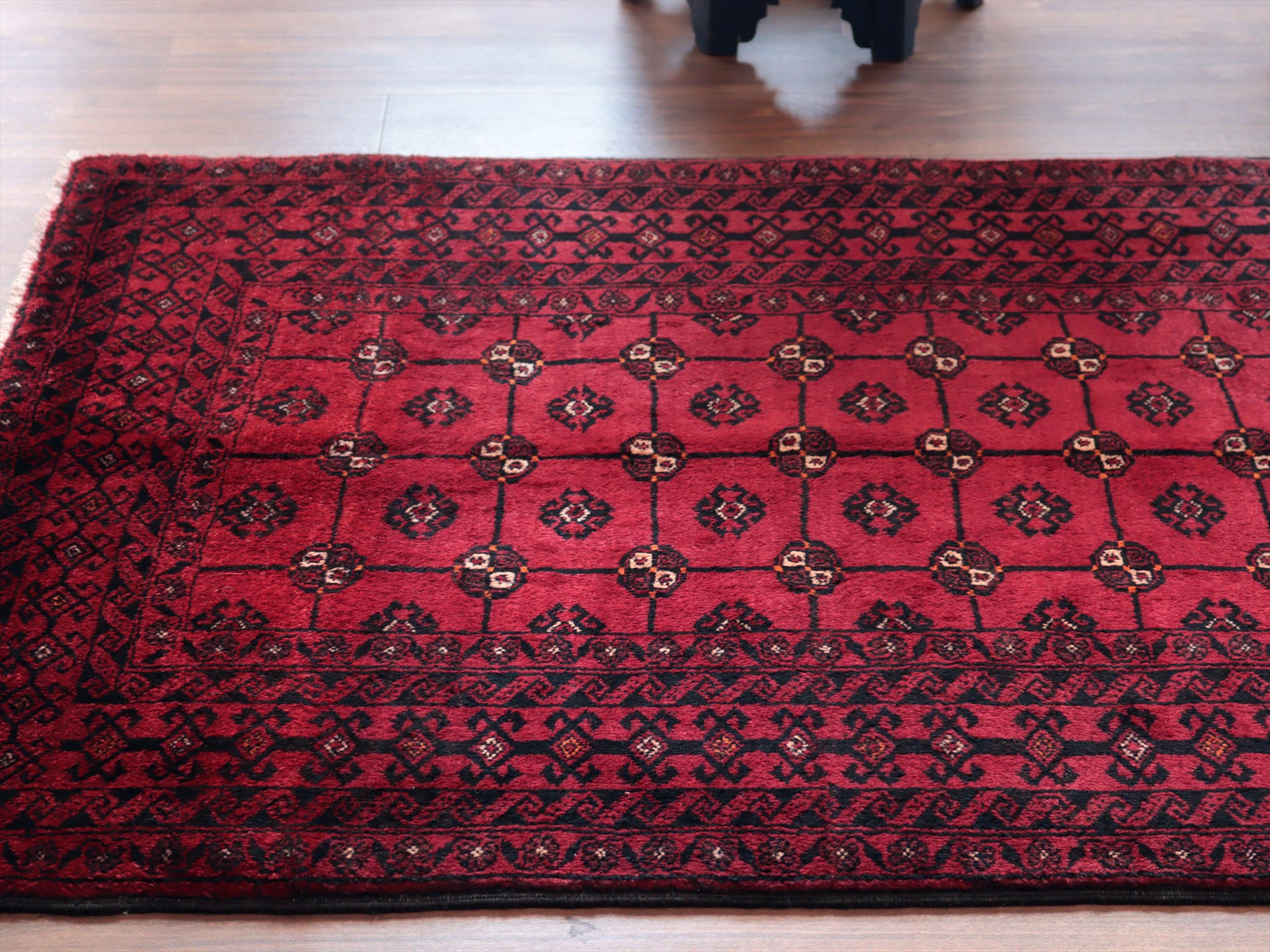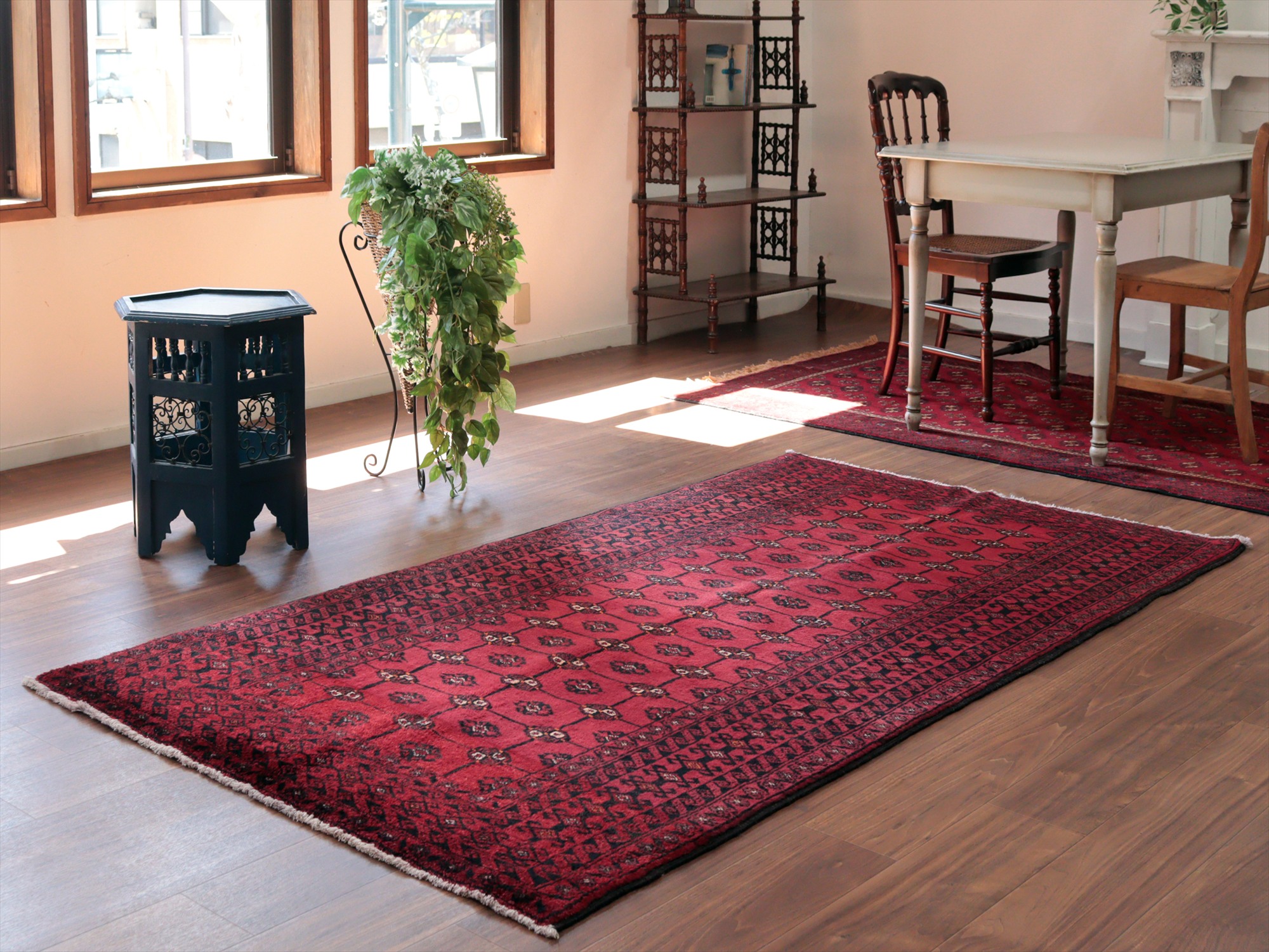 | イラン東部からアフガン・パキスタンなどに住むバルーチ族のカーペット。赤地にギュルのモチーフが入ったバルーチの典型的なデザインです。中央のフィールドには、文様が格子状に並ぶように織られていてクラシカルな雰囲気が良く出ています。 |