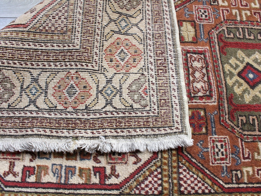 | 目が細かくつんで、しっかりした織りの薄手のカーペット。オールドですが、毛足(パイル)の抜け落ちなどはほとんどなく、きれいな状態です。厚みは5mm強の薄手のカーペット。 |