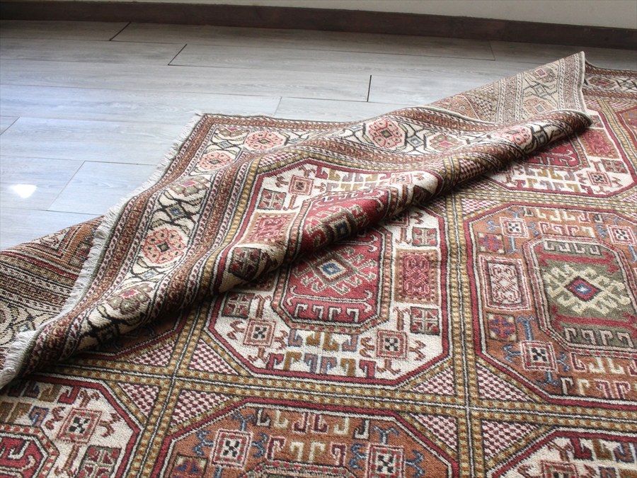 | 目の細かな織りのカイセリ地方のカーペット。年代はさほど古いものではありませんが、販売用ではなく、自分たちが家庭で使うために織った伝統的なじゅうたんです。1970年以降のカイセリ地方では、すでに遊牧生活から定住に変わっていて、大きなサロンで家族みんながくつろぐために大型の絨毯が必要だったのでしょう。横幅の広い大型サイズで、ダイニングテーブルの下などにもぴったりです。 |