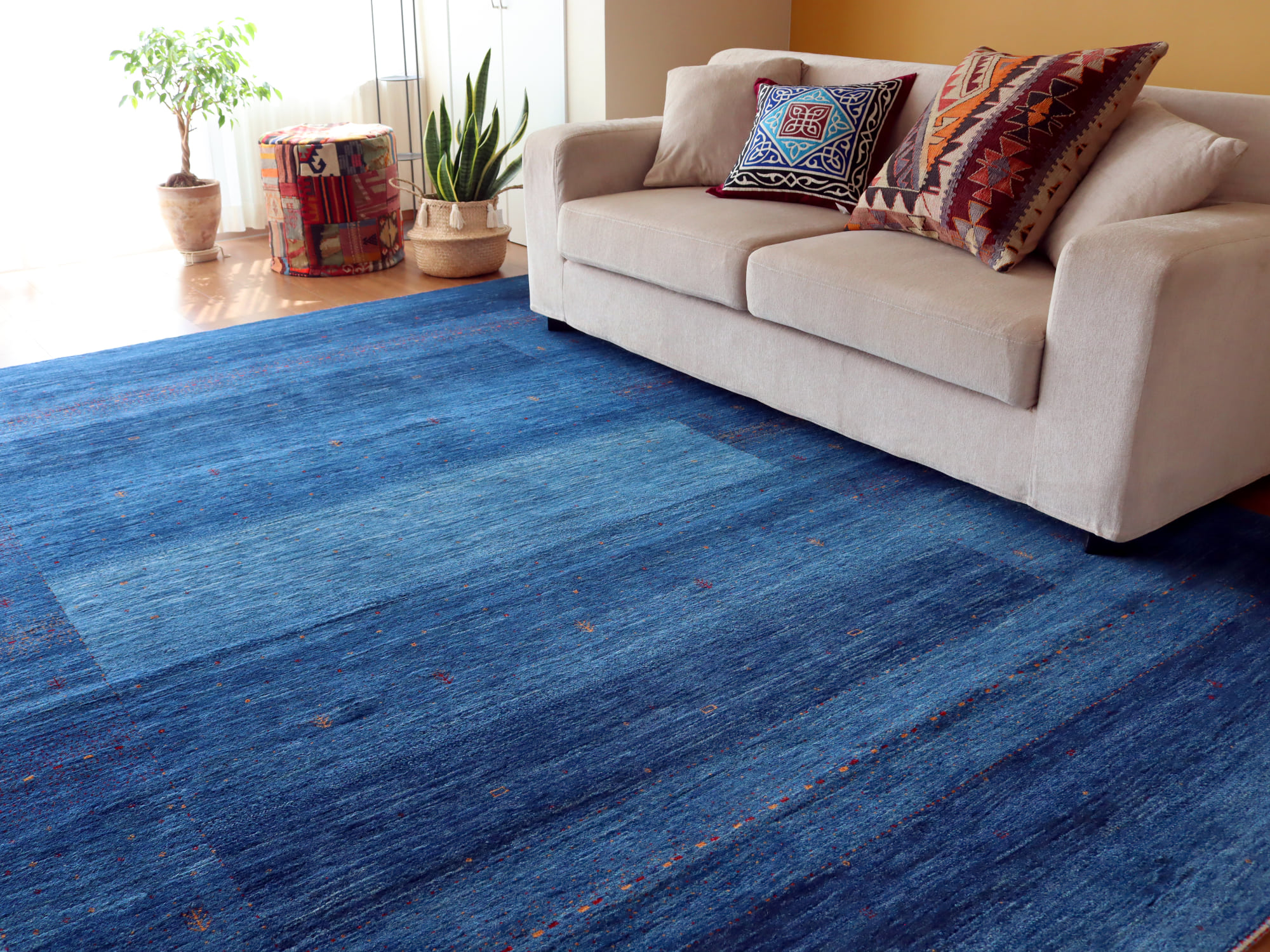 ギャッベ/ロリアタシュLoriAtash ギャベ 最上級の織り 大きい手織りラグ 大型ルームサイズ ブルー・スクエアデザイン・植物モチーフ