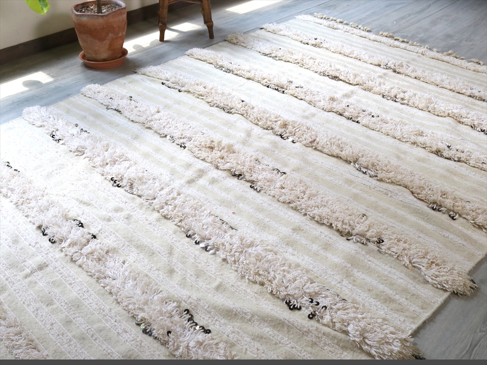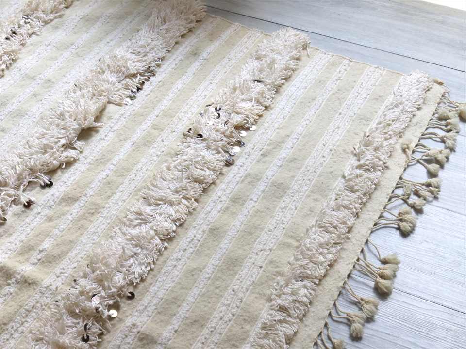 | スパンコールとふわふわのパイルが織り込まれた、真っ白なウールの織物です。モロッコのベルベル族の伝統的な結婚式のために準備され、テントの室内に飾ったり、ベッドやソファにかぶせたりして使われたということです。織られてから50年以上は経っていますが、大切に保管してありきれいな状態です。 ベースの織り地はやわらかな平織りで、途中にパイル織りで立体的なポンポンのような飾りが入っています。お部屋で使うにも、ラグとしてフロアに敷くよりは、ベッドカバーやソファースロー、間仕切りカーテンのようにお使いいただくのがおすすめです。 |
