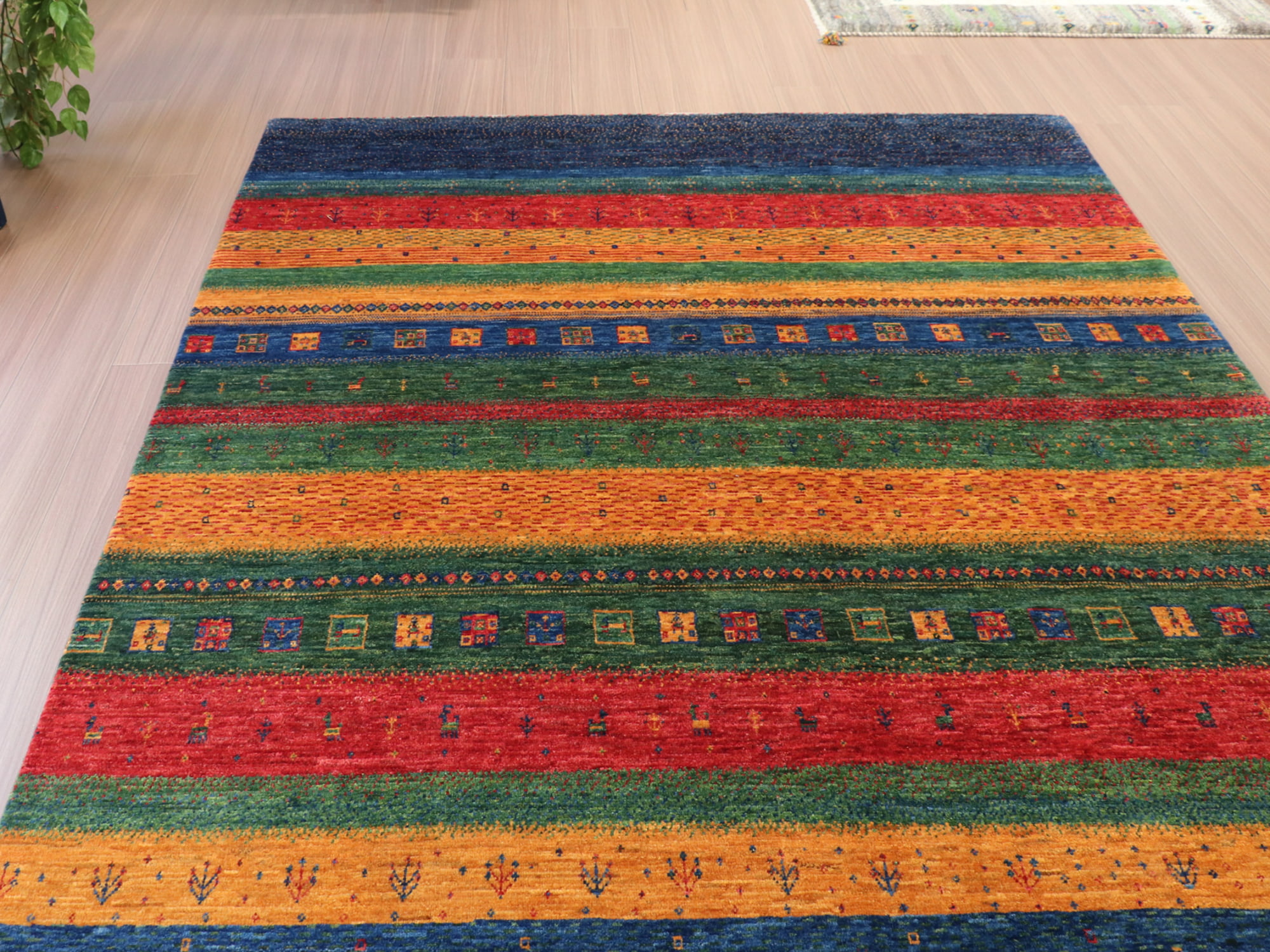 - Gabbeh ギャベ イラン直輸入ギャッベ・リズバフ ・リビングサイズ カラフル ストライプ ボーダー/カラフルスクエア 動物と植物モチーフ